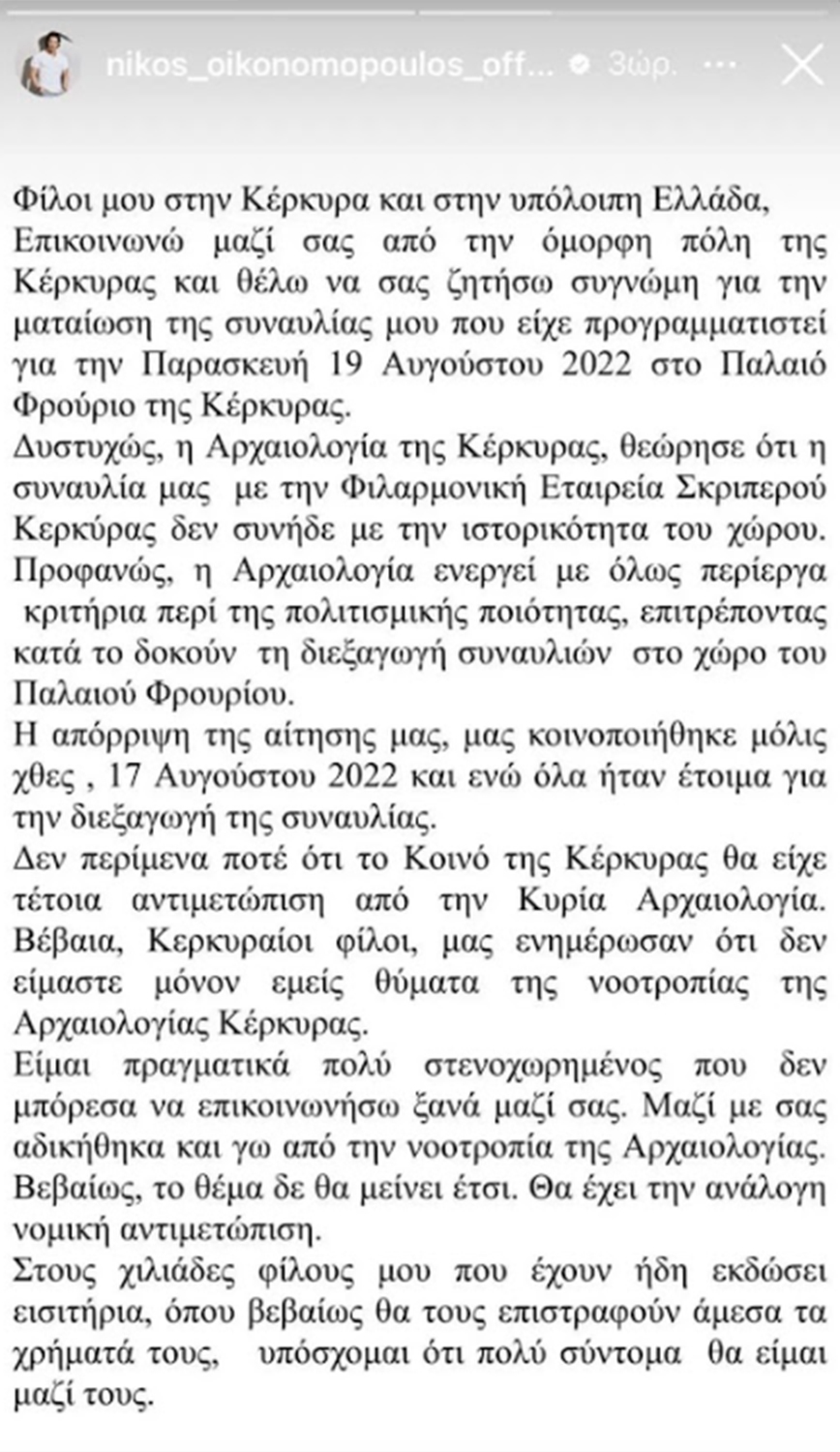 «Φίλοι μου στην Κέρκυρα και στην υπόλοιπη Ελλάδα. Επικοινωνώ μαζί σας από την όμορφη πόλης της Κέρκυρας και θέλω να σας ζητήσω συγγνώμη για τη ματαίωση της συναυλίας μου που είχε προγραμματιστεί για την Παρασκευή 19 Αυγούστου 2022 στο Παλαιό Φρούριο της Κέρκυρας. Δυστυχώς, η Αρχαιολογία της Κέρκυρας, θεώρησε ότι η συναυλία μας με την Φιλαρμονική Εταιρία Σκριπερού Κερκύρας δεν σύναδε με την ιστορικότητα του χώρου. Προφανώς, η Αρχαιολογία ενεργεί με όλως περίεργα κριτήρια περί της πολιτισμικής ποιότητας, επιτρέποντας κατά το δοκούν τη διεξαγωγή συναυλιών στον χώρο του Παλαιού Φρουρίου. Η απόρριψη της αίτησής μας, μας κοινοποιήθηκε μόλις χθες, 17 Αυγούστου 2022 και ενώ όλα ήταν έτοιμα για τη διεξαγωγή της συναυλίας. Δεν περίμενα ποτέ ότι το κοινό της Κέρκυρας θα είχε τέτοια αντιμετώπιση από την Κυρία Αρχαιολογία. Βέβαια, Κερκυραίοι φίλοι, μας ενημέρωσαν ότι δεν είμασταν μόνο εμείς θύματα της νοοτροπίας της Αρχαιολογίας Κέρκυρας. Είμαι πραγματικά πολύ στεναχωρημένος που δεν μπόρεσα να επικοινωνήσω μαζί σας. Μαζί με εσάς αδικήθηκα κι εγώ από την νοοτροπία της Αρχαιολογίας. Βεβαίως, το θέμα δεν θα μείνει έτσι. Θα έχει την ανάλογη νομική αντιμετώπιση. Στους χιλιάδες φίλους μου που έχουν ήδη εκδώσει εισιτήρια, όπου βεβαίως θα τους τους επιστραφούν άμεσα τα χρήματά τους, υπόσχομαι ότι πολύ σύντομα θα είμαι μαζί τους» έγραψε ο Νίκος Οικονομόπουλος.