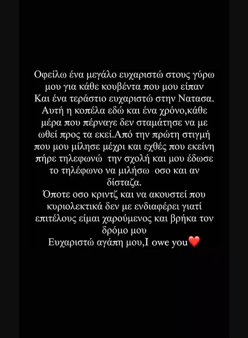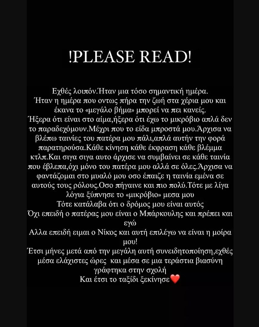 «Άρχισα να φαντάζομαι στο μυαλό μου όσο έπαιζε η ταινία εμένα σε αυτούς τους ρόλους. Όσο πήγαινε και πιο πολύ. Τότε με λίγα λόγια ξύπνησε το «μικρόβιο» μέσα μου. Τότε κατάλαβα ότι ο δρόμος μου είναι αυτός. Όχι επειδή ο πατέρας μου είναι ο Ανδρέας Μπάρκουλης και πρέπει και εγώ. Αλλά επειδή είμαι ο Νίκος και αυτή επιλέγω να είναι η μοίρα μου. Έτσι, μήνες μετά από αυτή τη μεγάλη συνειδητοποίηση, χθες μέσα σε ελάχιστες ώρες και με μια μεγάλη βιασύνη γράφτηκα στη σχολή. Και έτσι το ταξίδι ξεκίνησε» ανακοίνωσε ο Νίκος Μπάρκουλης στα Instagram Stories του.