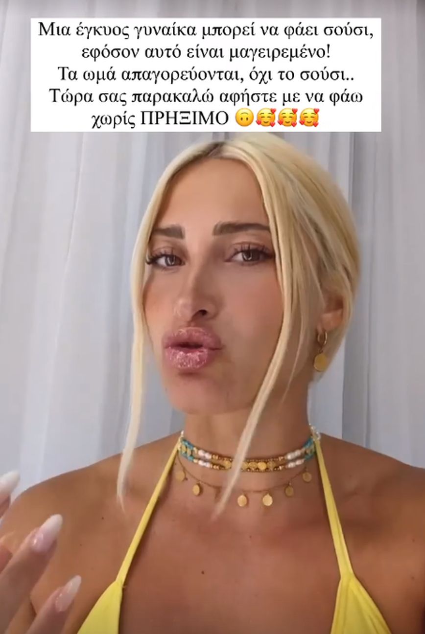 «Μόλις έχω φτάσει σπίτι και μου χετε στείλει ένα κάρο μηνύματα, το direct μου είναι…έτσι πηγαίνει. Γιατί σούσι στην εγκυμοσύνη. Παιδιά ναι, στην εγκυμοσύνη απαγορεύονται τα ωμά, αλλά υπάρχει και ψημένο σούσι, μαγειρεμένο σούσι ξέρετε, είτε τηγανητό είτε στον φούρνο ακόμα. Σούσι μαγειρεμένο, μπορώ να το φάω και αυτό πήρα κι έφαγα. Μην ανησυχείτε για την υγεία μου είμαι μια χαρά. Ξέρω ότι είμαι έγκυος και ξέρω τι να αποφεύγω. Ευχαριστώ».