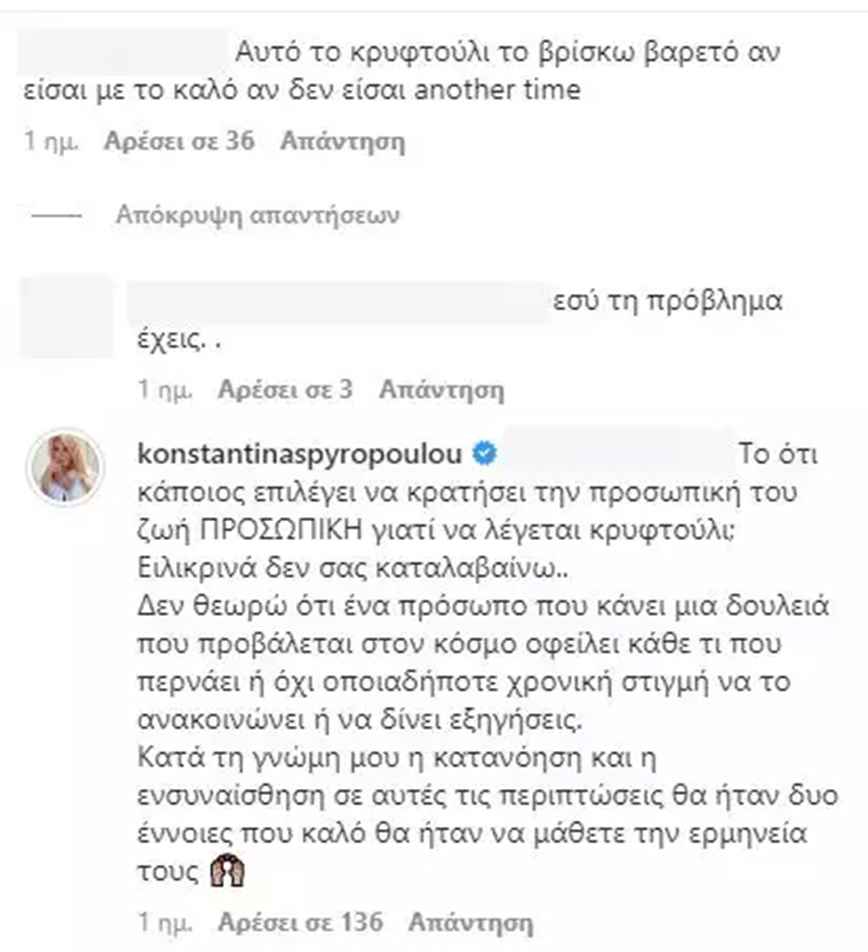Μια follower της παρουσιάστριας στο Instagram, σχολίασε σε ανάρτησή της από τις διακοπές της πως η παρουσιάστρια παίζει «κρυφτούλι». Η Κωνσταντίνα Σπυροπούλου επέλεξε να απαντήσει στο σχόλιο αυτό και συμβούλευσε τη γυναίκα να δείχνει μεγαλύτερη ενσυναίσθηση και κατανόηση.