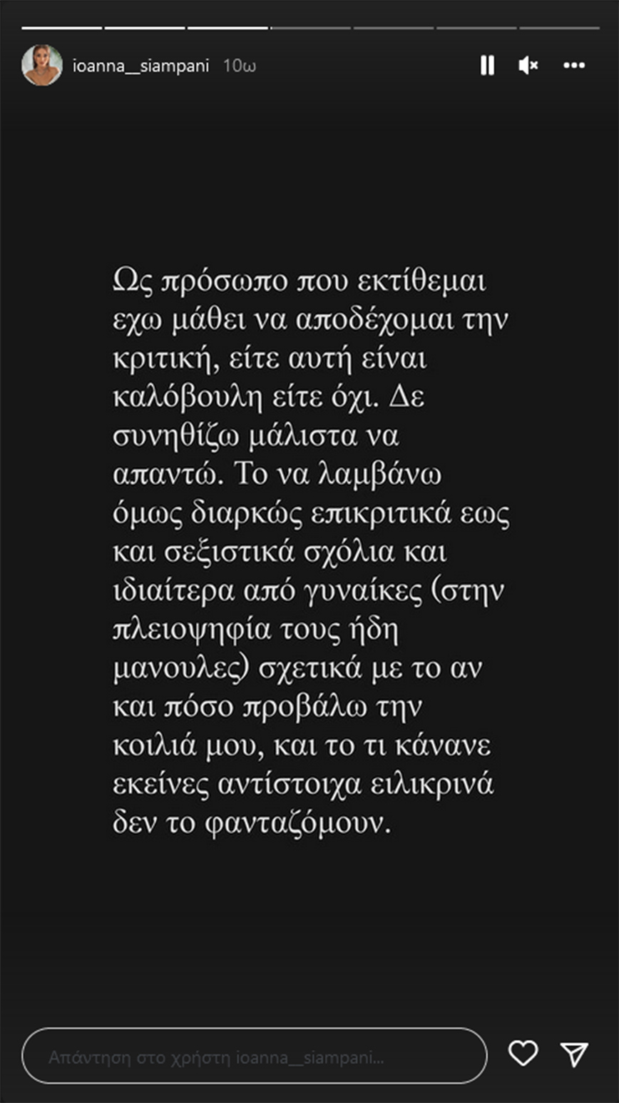 «Ως πρόσωπο που εκτίθεμαι έχω μάθει να αποδέχομαι την κριτική είτε αυτή είναι καλόβουλη είτε όχι. Δεν συνηθίζω μάλιστα να απαντώ. Το να λαμβάνω όμως διαρκώς επικριτικά έως και σεξιστικά σχόλια και ιδιαίτερα από γυναίκες (στην πλειοψηφία τους ήδη μανούλες) σχετικά με το αν και πόσο προβάλλω την κοιλιά μου, και το τι κάνανε εκείνες αντίστοιχα ειλικρινά δεν το φανταζόμουν.