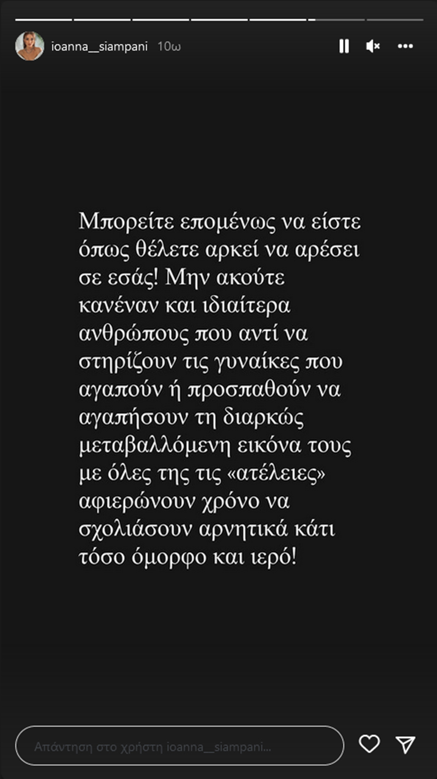 Μπορείτε επομένως να είστε όπως θέλετε αρκεί να αρέσει σε εσάς! Μην ακούτε κανέναν και ιδιαίτερα ανθρώπους που αντί να στηρίζουν τις γυναίκες που αγαπούν ή προσπαθούν να αγαπήσουν τη διαρκώς μεταβαλλόμενη εικόνα τους με όλες της τις «ατέλειες» αφιερώνουν χρόνο να σχολιάσουν αρνητικά κάτι τόσο όμορφο και ιερό» έγραψε χαρακτηριστικά η Ιωάννα Σιαμπάνη.