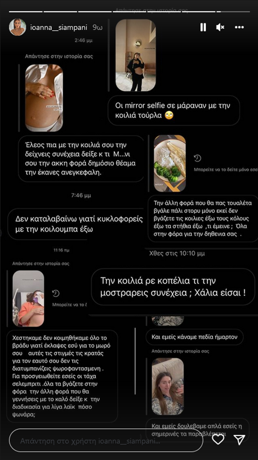 Όμως, το τελευταίο διάστημα δέχεται όλο και περισσότερα σχόλια από γυναίκες που την «κράζουν» για αυτή την επιλογή της και έτσι δημοσίευσε κάποια από τα μηνύματα που της στέλνουν. Μεταξύ άλλων φαίνεται ένα σχόλιο «οι σέλφι σε μάραναν με την κοιλιά τούρλα».