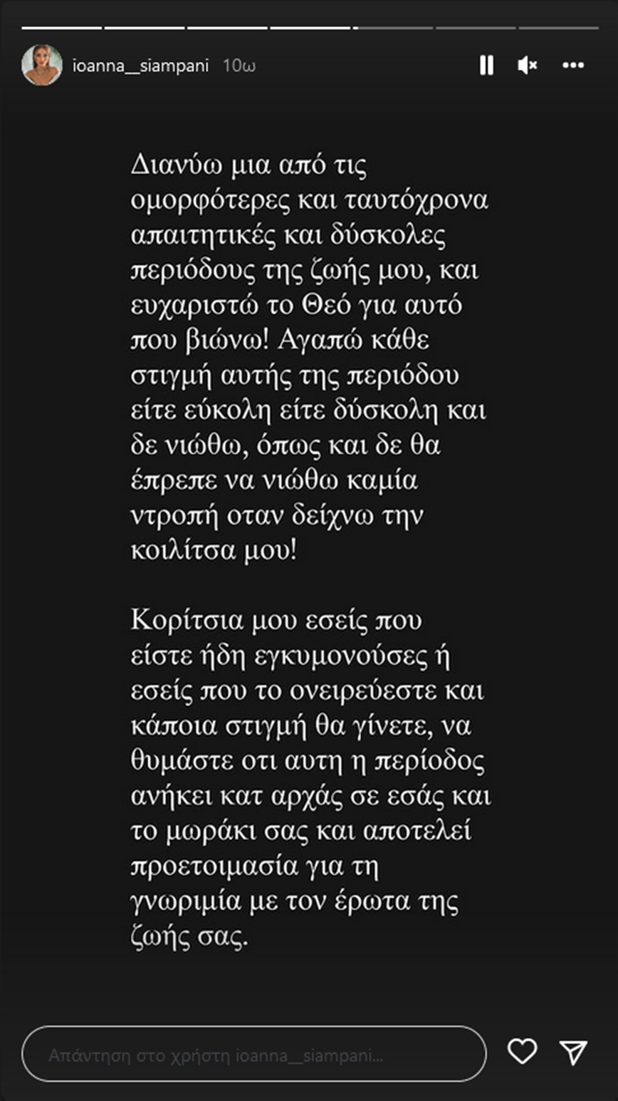Η Ιωάννα Σιαμπάνη θέλησε να απαντήσει με μια μακροσκελή ανάρτηση υπογραμμίζοντας ότι το πώς ζει μία γυναίκα την εγκυμοσύνη της είναι αυστηρά δική της υπόθεση και δεν αφορά κανέναν άλλον.