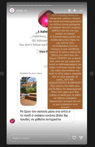 Στην συνέχεια, η Ιωάννα Τούνη επανήλθε στο θέμα και μέσω ενός story ανέφερε: «Μην κρίνετε όλους τους άλλους πίσω από ένα πληκτρολόγιο. Χ…. με για τη γνώμη σας. Σταματήστε να το κάνετε αυτό το πράγμα online. Δηλαδή μπαίνετε online είστε πίσω από το πληκτρολόγιο και γράφετε κακία κακία. Νιώθετε καλύτερα με αυτό που κάνετε; Δηλαδή πραγματικά. Πηγαίνετε σε έναν ψυχολόγο, δεν είναι κακό. Όχι στο Instagram, όχι στα social και όχι στην πραγματικότητα, σταματήστε».