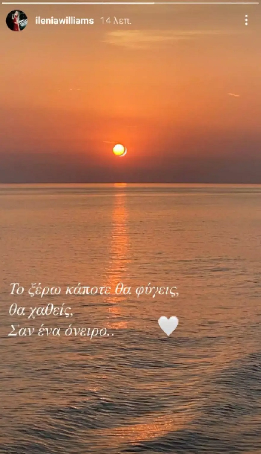 Συγκεκριμένα, δημοσίευσε μία φωτογραφία που δείχνει ένα ηλιοβασίλεμα σε κάποια παραλία και έγραψε: «Το ξέρω κάποτε θα φύγεις, θα χαθείς, σαν ένα όνειρο».