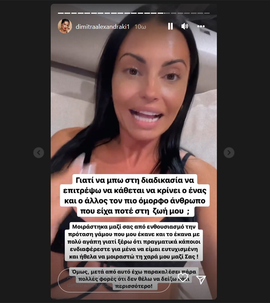«Σας παρακαλώ πάρα μα πάρα πολύ για ακόμα μια φορά! Αν όπως λέτε με αγαπάτε, με συμπαθείτε και με στηρίζετε, στηρίξτε και αυτή την επιλογή μου. Γιατί να μπω στη διαδικασία να επιτρέψω να κρίνει ο ένας και ο άλλος τον πιο όμορφο άνθρωπο που είχα ποτέ στη ζωή μου; Μοιράστηκα μαζί σας από ενθουσιασμό την πρόταση γάμου που μου έκανε και το έκανε και το έκανε με πολύ αγάπη γιατί ξέρω ότι πραγματικά κάποιοι ενδιαφέρεστε για μένα να είμαι ευτυχισμένη και ήθελα να μοιραστώ τη χαρά μου μαζί σας. Όμως, μετά από αυτό έχω παρακαλέσει πάρα πολλές φορές ότι δεν θέλω να δείξω κάτι περισσότερο» γράφει στη λεζάντα των βίντεο που ανέβασε η Δήμητρα Αλεξανδράκη.