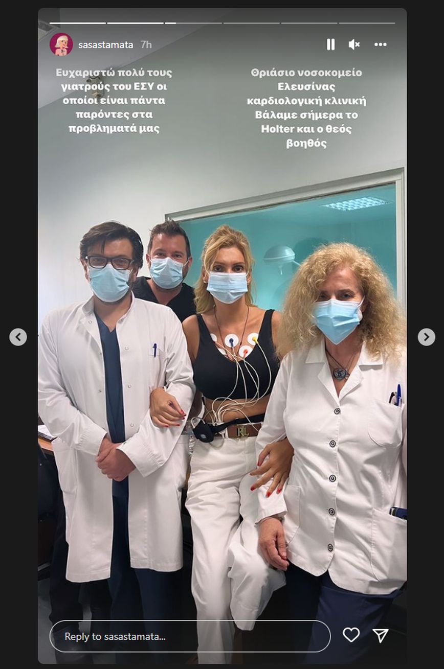 Στη φωτογραφία που ανάρτησε, η Σάσα Σταμάτη αναφέρει πως είναι στο Θριάσιο νοσοκομείο της Ελευσίνας και πως τοποθέτησε Holter, ενώ δεν παρέλειψε να ευχαριστήσει τους γιατρούς.