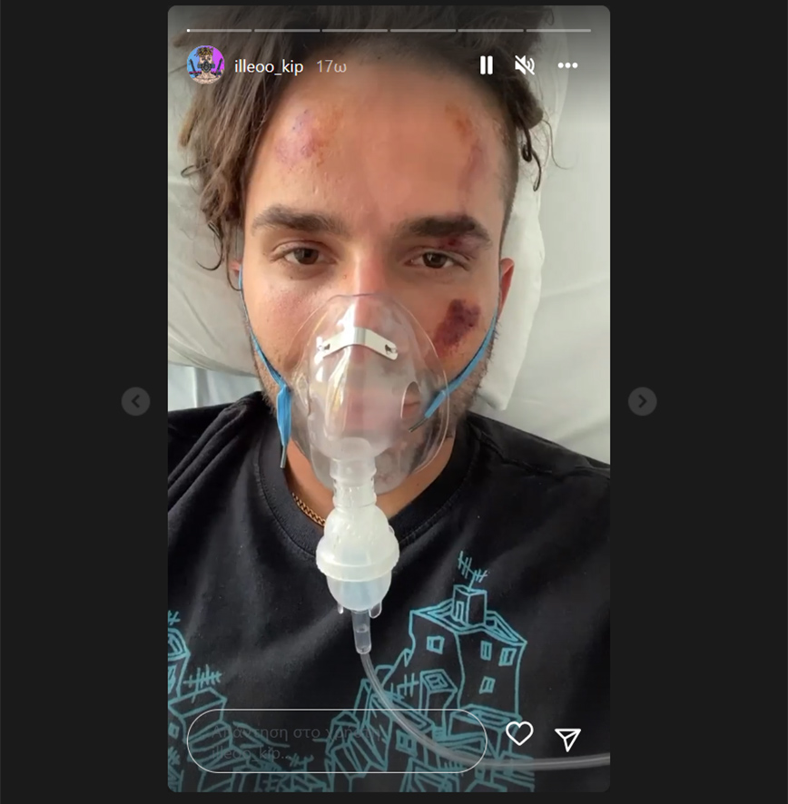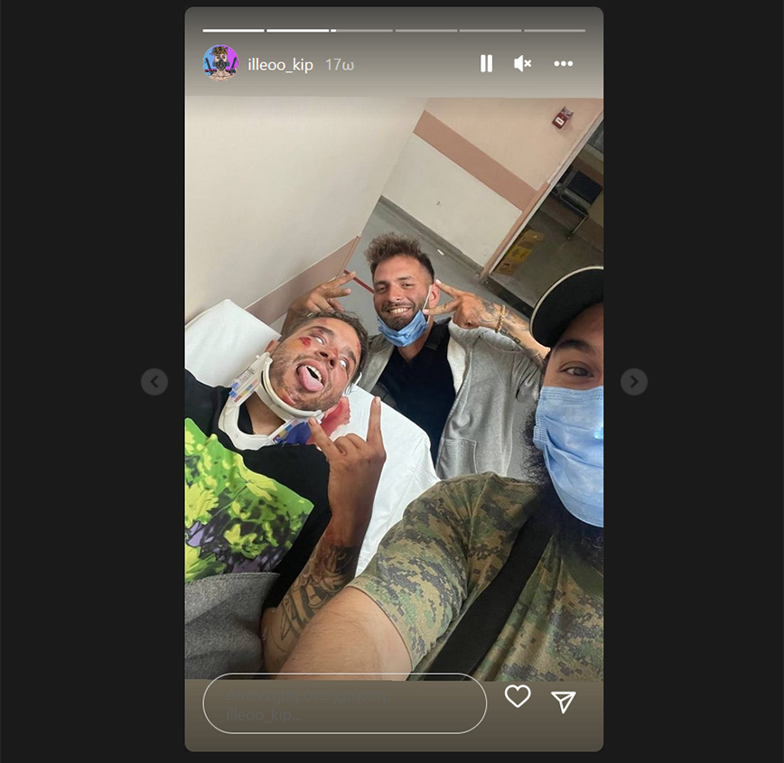 Σε stories που ανάρτησε από το νοσοκομείο δείχνει τα σοβαρά τραύματα που φέρει. Μάλιστα σε ένα από τα stories έγραψε την ατάκα «Όταν στα σκάει», ενώ απαθανατίστηκε με τους φίλους του στο κρεβάτι.