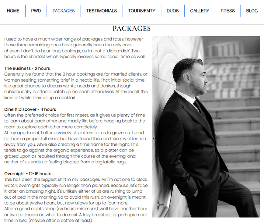 Κοιμάται κάθε μήνα με περίπου 7 γυναίκες ηλικίας 23-70 ετών, αν και όπως λέει τον προτιμούν γυναίκες σχεδόν συνομίληκες του. «Οι περισσότερες γυναίκες είναι στο τακτικό πελατολόγιό μου, υπάρχουν βέβαια και ζευγάρια που με κλείνουν γιατί θέλουν να δοκιμάσουν κάτι διαφορετικό» λέει στην αυστραλιανή Daily Mail και αναμεταδίδει η New York Post.