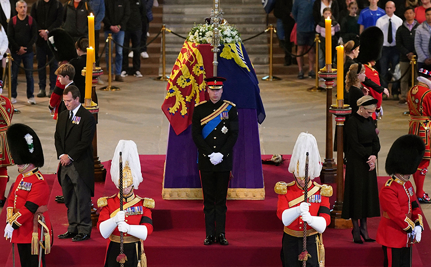 Ο πρίγκιπας Ουίλιαμ ήταν τοποθετημένος στη μία άκρη του φέρετρου, με θέα τη βόρεια είσοδο, ενώ ο Χάρι ήταν τοποθετημένος στην αντίθετη άκρη, με θέα το σημείο της αίθουσας όπου χιλιάδες άνθρωποι έχουν εισέλθει τις τελευταίες ημέρες. Το κοινό συνέχισε να περνά ενώ τα εγγόνια της βασίλισσας φρουρούσαν, με ορισμένες γυναίκες να σκουπίζουν τα δάκρυα από το πρόσωπό τους καθώς έβγαιναν από την αίθουσα. Στις 6.15 μ.μ., ακούστηκε το χτύπημα και τα εγγόνια τερμάτισαν την αγρυπνία τους.