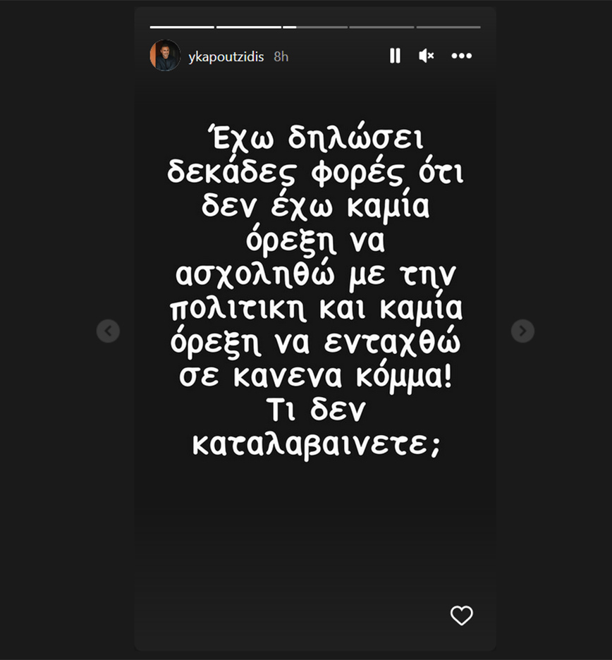 «Έχω δηλώσει δεκάδες φορές ότι δεν έχω καμία όρεξη να ασχοληθώ με την πολιτική και καμία όρεξη να ενταχθώ σε κανένα κόμμα! Τι δεν καταλαβαίνετε;», έγραψε αρχικά ο Γιώργος Καπουτζίδης .