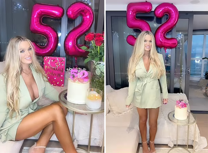 Η ξανθιά σεξοβόμβα ποζάρει μπροστά σε δύο μπαλόνια με τον αριθμό 52.