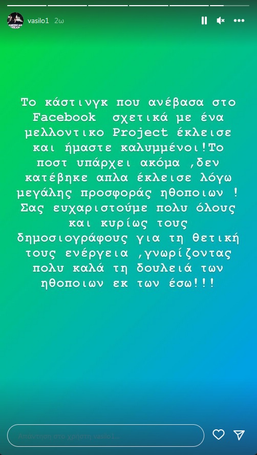 Συγκεκριμένα, έγραψε: «Το κάστινγκ που ανέβασα στο facebook σχετικά με ένα μελλοντικό πρότζεκτ έκλεισε και είμαστε καλυμμένοι. Το ποστ υπάρχει ακόμα, δεν κατέβηκε, απλά έκλεισε λόγω μεγάλης προσφοράς ηθοποιών. Σας ευχαριστούμε πολύ όλους και κυρίως τους δημοσιογράφους για τη θετική τους ενέργεια, γνωρίζοντας πολύ καλά τη δουλειά των ηθοποιών εκ των έσω».