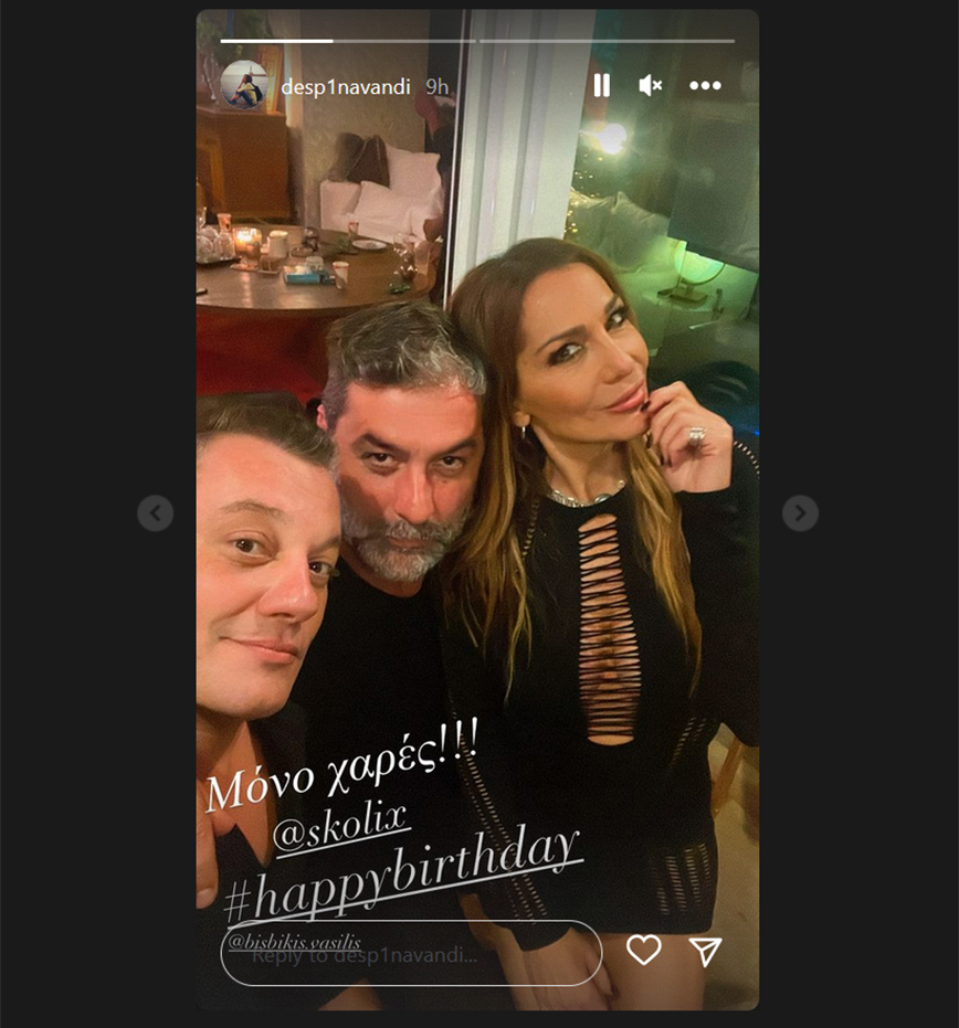 Η Δέσποινα Βανδή επέλεξε ένα μίνι μαύρο φόρεμα που αναδεικνύει τη σιλουέτα της και πόζαρε στην αγκαλιά του συντρόφου της, Βασίλη Μπισμπίκη, μαζί με τον εορτάζοντα.