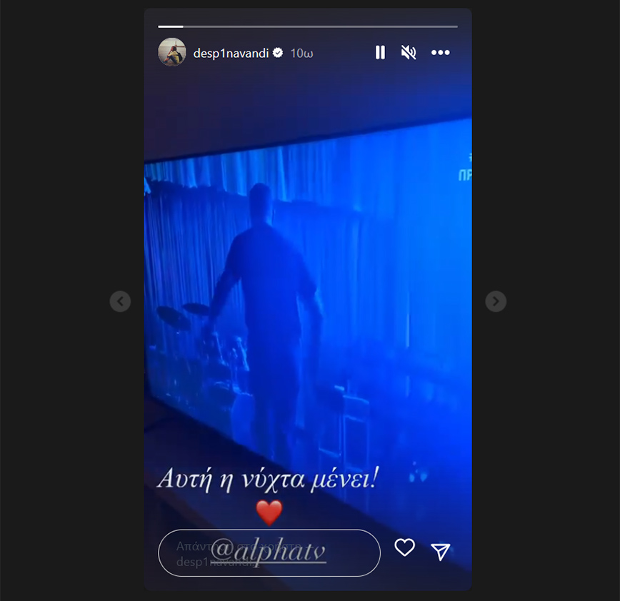 Καθηλωμένη στην τηλεόρασή της ήταν απ’ ό,τι φαίνεται η Δέσποινα Βανδή το βράδυ της Δευτέρας, για να καμαρώσει τον Βασίλη Μπισμπίκη στην πολυαναμενόμενη πρεμιέρα της σειράς «Αυτή η Νύχτα Μένει» στον Alpha.