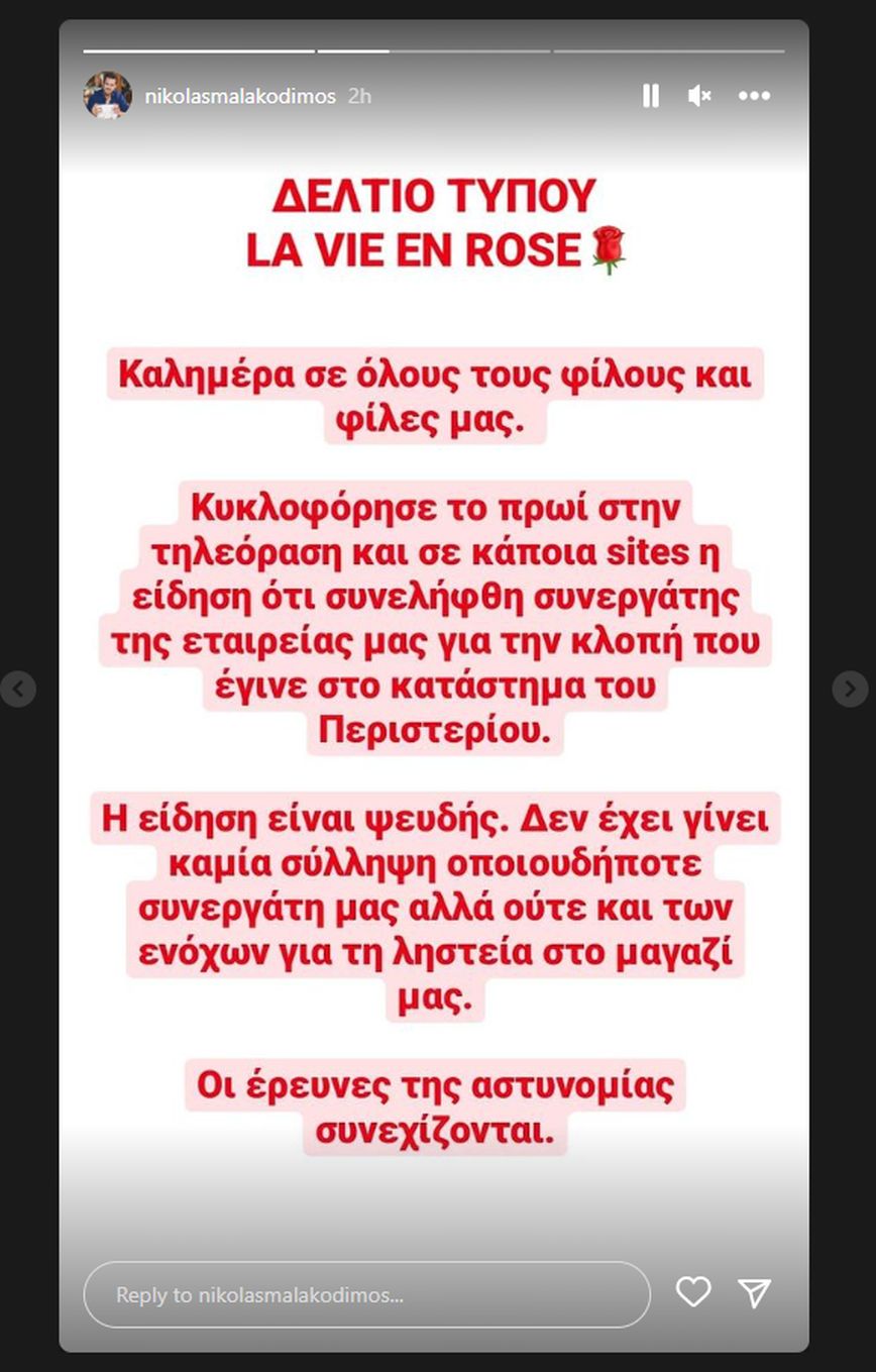 Τόσο η Δήμητρα Κατσαφάδου όσο και ο Νικόλαος Μαλακοδήμος, δημοσίευσε στους προσωπικούς τους λογαριασμούς στο Instagram το δελτίο τύπου που εξέδωσαν για την εταιρία «La Vie en Rose» η οποία τους ανήκει, με την οποία ξεκαθαρίζεται πως καμία συνεργάτιδα του καταστήματος τους δεν συνελήφθη για την ληστεία και πως γενικότερα δεν έχει γίνει κάποια σύλληψη για το περιστατικό ενώ οι έρευνες της αστυνομίας συνεχίζονται.