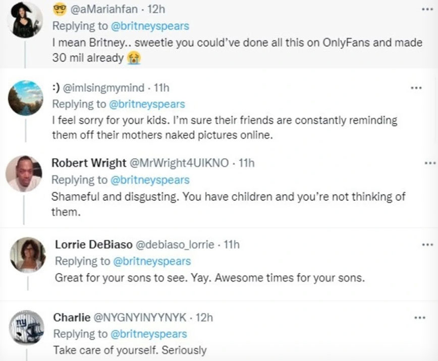 Η Μπρίτνεϊ Σπίαρς ανάρτησε στο Twitter μια νέα γυμνή φωτογραφία της και τα σχόλια έπεσαν «βροχή», όμως αυτή τη φορά δεν ήταν καθόλου διθυραμβικά, αφού πολλοί χρήστες αντέδρασαν αρνητικά.