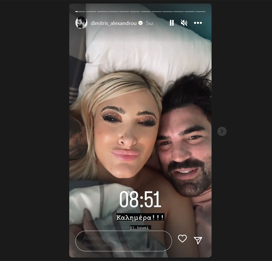 Σε story στον προσωπικό του λογαριασμό στο Instagram, στο οποίο σχολιάζει το έντονο μακιγιάζ της από το προηγούμενο βράδυ. «Ήμουν πολύ κουρασμένη χθες», του λέει η Ιωάννα Τούνη στο βίντεο, με τον Δημήτρη Αλεξάνδρου να της απαντάει : «Ναι, αλλά εγώ νιώθω ότι κοιμήθηκα με την Κατερίνα Στανίση».