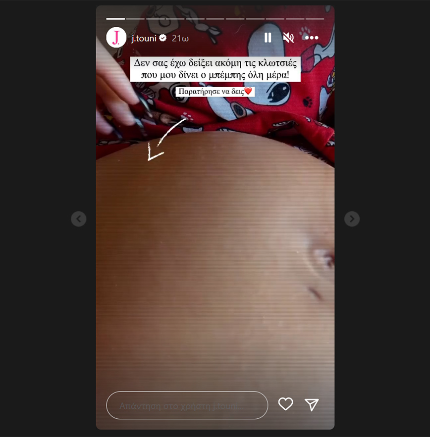 Βίντεο στο οποίο δείχνει το μωρό της που θα έρθει σε δύο περίπου μήνες στη ζωή να κλωτσάει ανέβασε στον προσωπικό της λογαριασμό στο Instagram η Ιωάννα Τούνη.