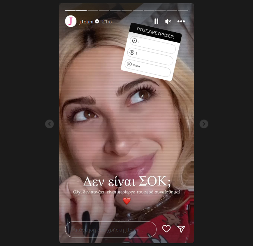«Σας έχω πει ότι το μωράκι κλωτσάει και το νιώθω κανονικότατα; Το έχουν νιώσει και το αγόρι μου και η κολλητή μου. Καλά, όταν αρχίσει να κλωτσάει και με το ποδαράκι, θα σας το δείξω να δείτε τι περίεργα που φαίνεται», είχε σχολιάσει η Ιωάννα Τούνη στο Ιnstagram.