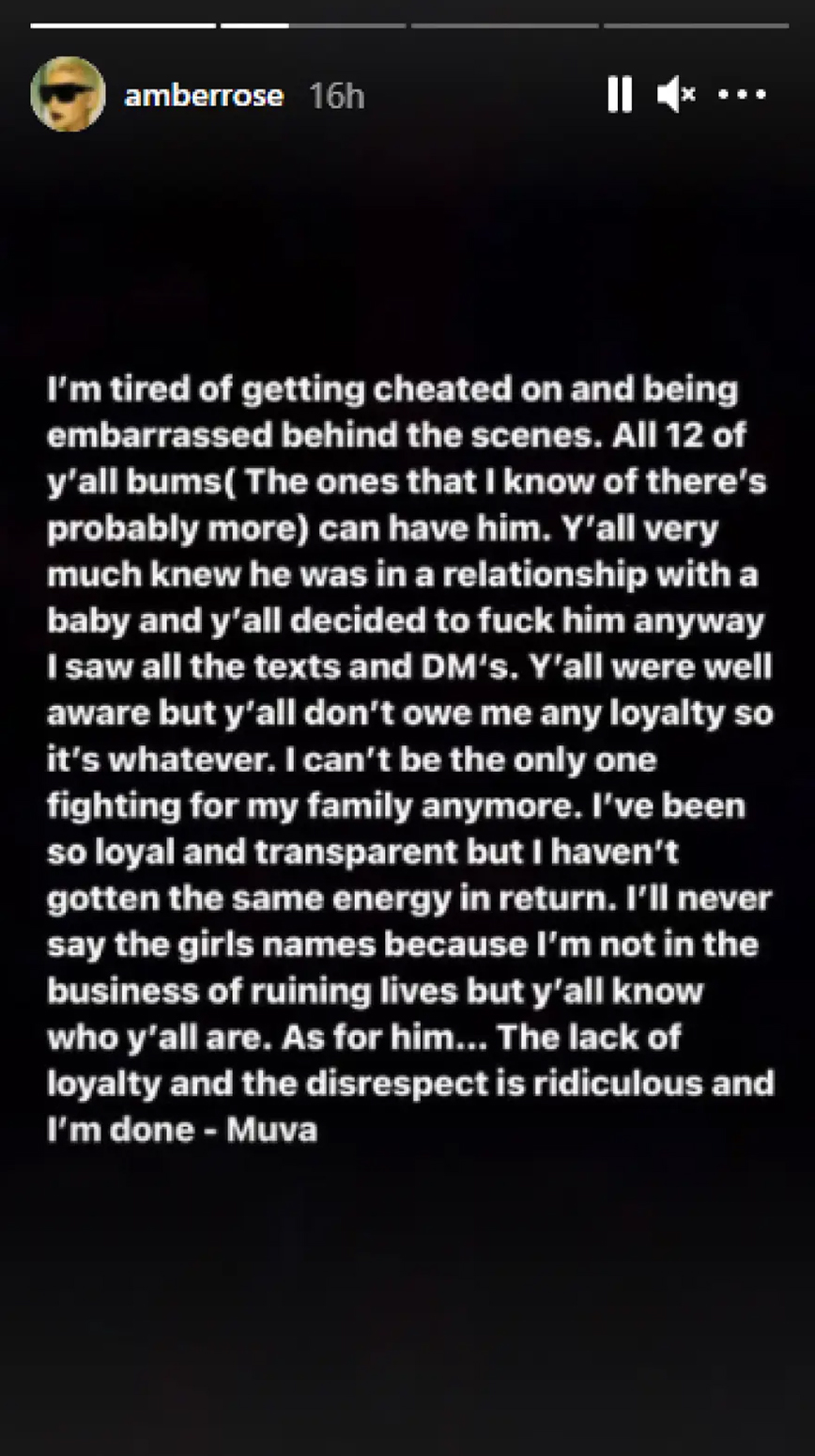 Η Άμπερ Ρόουζ που ήταν σε σχέση μαζί του από το 2018 και το επόμενο έτος γέννησε το παιδί τους, είχε αναφέρει σε μία ανάρτηση το εξής: «Bαρέθηκα να με απατάει και να με ρεζιλεύει στα παρασκήνια. Όλες εσείς οι 12 (αυτές που γνωρίζω τουλάχιστον) μπορείτε να τον πάρετε, είναι δικός σας. Ξέρετε όλες ότι έχει μία σχέση και ένα μωρό, αλλά επιλέξατε να πάτε μαζί του παρόλα αυτά. Είδα τα μηνύματα και τις φωτογραφίες σας. Όλες σας γνωρίζατε και καμιά σας δεν ενδιαφέρθηκε για εμένα. Δεν μπορώ να παλεύω πλέον, μόνη μου για την οικογένειά μου. Ήμουν πιστή και ανοιχτόμυαλη, όμως δεν έχω την ίδια ενέργεια για να την σπαταλάω έτσι, πια. Δεν θα πω ποτέ τα ονόματα αυτών των κοριτσιών, γιατί δεν έχω σκοπό να καταστρέψω τις ζωές τους, αλλά όλες εσείς ξέρετε ποιες είστε. Όσο για εκείνον, αυτή η έλλειψη πίστης και σεβασμού είναι γελοία, οπότε εγώ τελείωσα με αυτό».