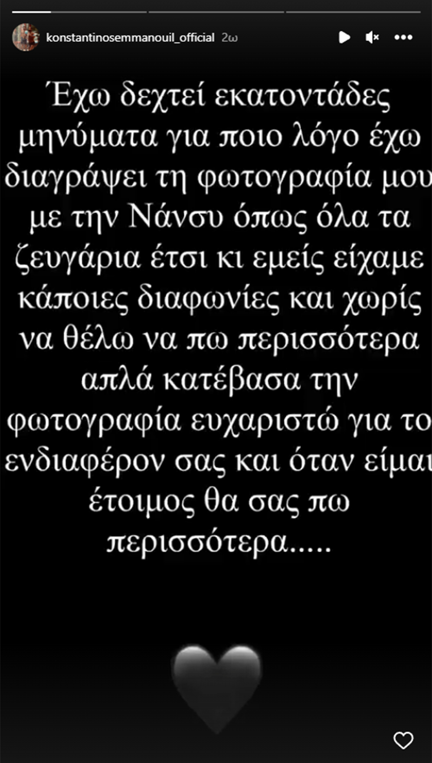 Αυτό όμως φαίνεται πως δεν θα γίνει καθώς ο Κωνσταντίνος Εμμανουήλ «κατέβασε» από το προσωπικό του λογαριασμό στο Instagram τις κοινές φωτογραφίες που είχε δημοσιεύσει με την Νάνσυ ενώ προχώρησε και σε ένα μήνυμα με αποδέκτες τους διαδικτυακούς του φίλους.
