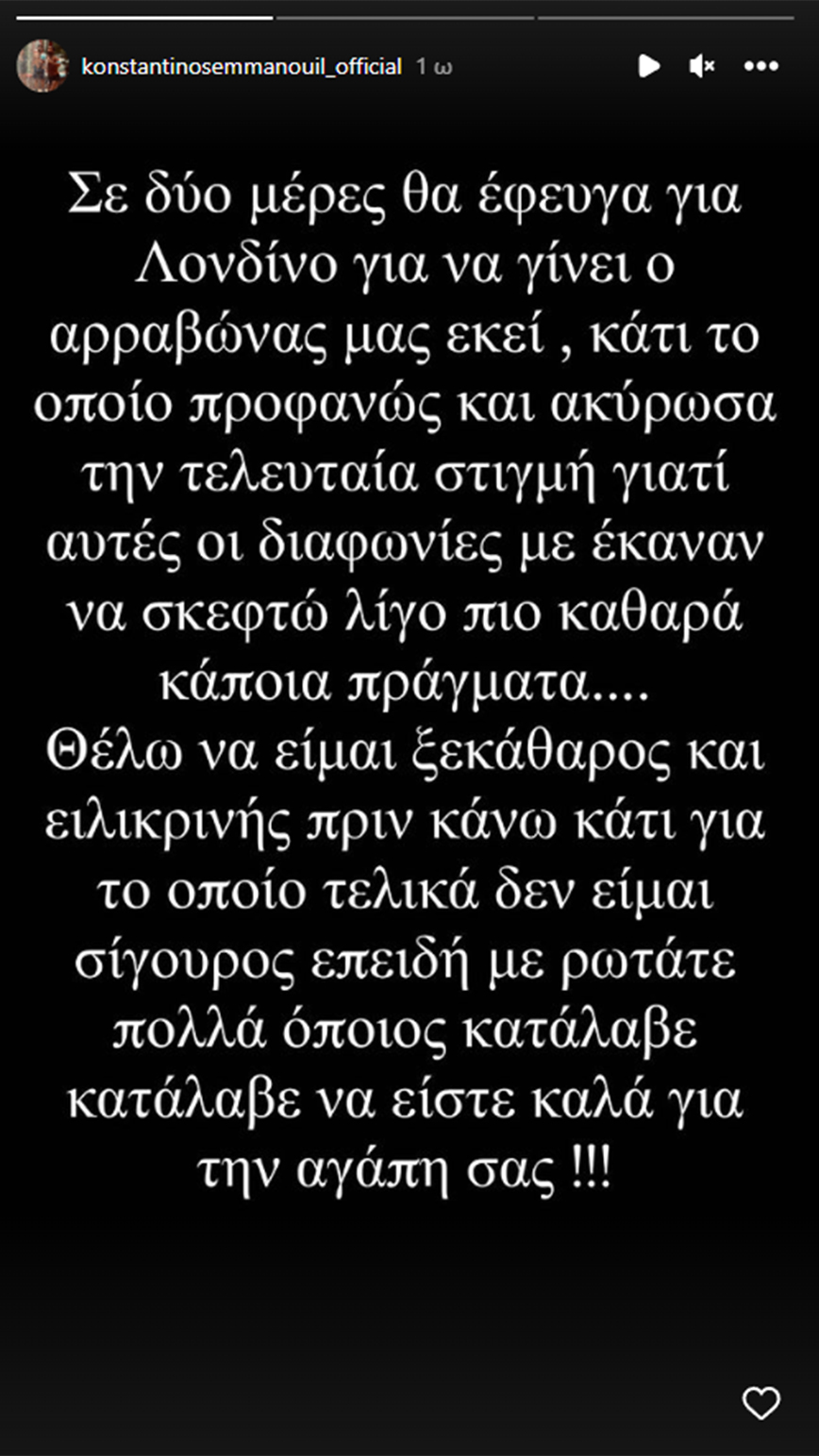 Λίγο καιρό πριν, ο Κωνσταντίνος Εμμανουήλ δήλωνε ερωτευμένος και έτοιμος να κάνει το επόμενο βήμα στην σχέση του με την αγαπημένη του Νάνσυ, αν και οι δυο τους γνωρίζονταν μόνο δυο μήνες. Μάλιστα, τότε ο πρώην παίκτης του Survivor και make up artist είχε κάνει γνωστό πως θα ταξίδευε στο Λονδίνο προκειμένου να διευθετήσουν ορισμένα πράγματα για το γάμο τους που θα γινόταν το καλοκαίρι του 2023.