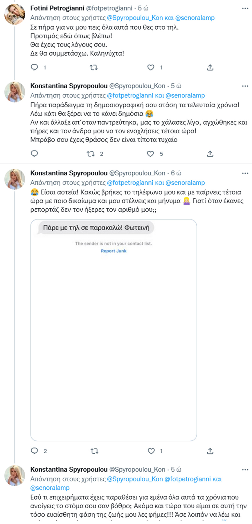 «Πήρα παράδειγμα τη δημοσιογραφική σου στάση τα τελευταία χρόνια! Λέω κάτι θα ξέρει να το κάνει δημόσια. Αν και άλλαξε απ´ οταν παντρεύτηκα, μας το χάλασες λίγο, αγχώθηκες και πήρες και τον άνδρα μου να τον ενοχλήσεις τέτοια ώρα! Μπράβο σου έχεις θράσος δεν είναι τίποτα τυχαίο» ανταπάντησε η Κωνσταντίνα Σπυροπούλου.