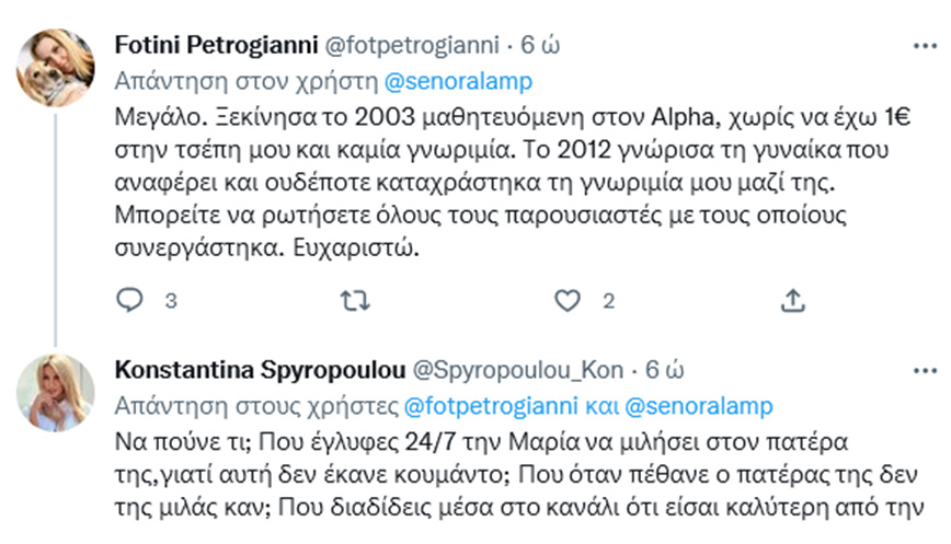 Με τη σειρά της η Φωτεινή Πετρόγιαννη έγραψε: «Μεγάλο. Ξεκίνησα το 2003 μαθητευόμενη στον Alpha, χωρίς να έχω 1 ευρώ στην τσέπη μου και καμία γνωριμία. Το 2012 γνώρισα τη γυναίκα που αναφέρει και ουδέποτε καταχράστηκα τη γνωριμία μου μαζί της. Μπορείτε να ρωτήσετε όλους τους παρουσιαστές με τους οποίους συνεργάστηκα. Ευχαριστώ».