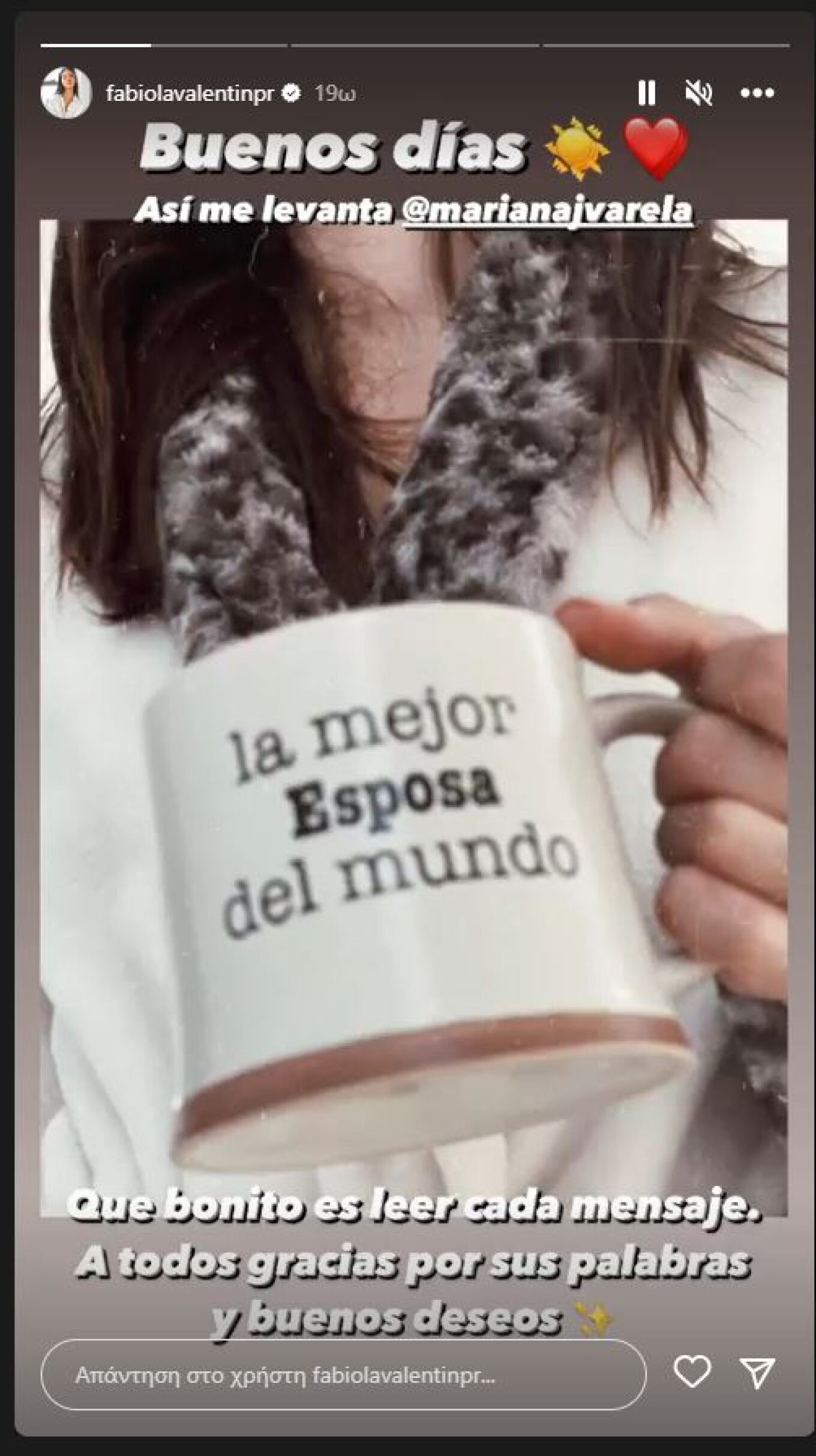 Αργότερα, η Βαλεντίν ανέβασε ένα story, όπου τη βλέπουμε να κρατάει μια κούπα καφέ που γράφει στα ισπανικά: «Η καλύτερη σύζυγος στον κόσμο», είπε αρχικά και πρόσθεσε: «Καλημέρα. Έτσι με ξυπνάει η Μαριάνα. Πόσο γλυκό είναι να διαβάζω κάθε μήνυμα. Σας ευχαριστώ όλους για τα καλά λόγια και τις ευχές».