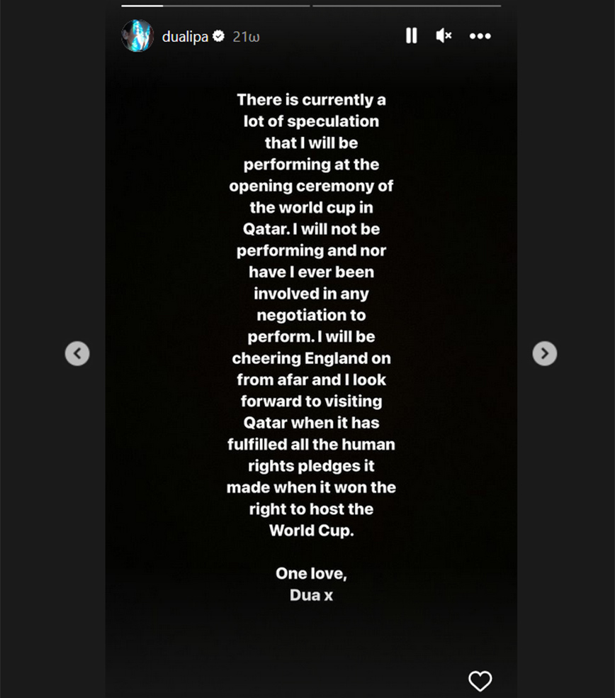 Σε δήλωση που κοινοποίησε στο Instagram της, η τραγουδίστρια ανέφερε: «Υπάρχουν πολλές εικασίες ότι θα εμφανιστώ στην τελετή έναρξης του Παγκοσμίου Κυπέλλου στο Κατάρ. Δεν θα τραγουδήσω και ούτε έχω συμμετάσχει ποτέ σε διαπραγματεύσεις για να εμφανιστώ. Θα επευφημήσω την Αγγλία από μακριά. Ανυπομονώ να επισκεφτώ το Κατάρ όταν θα έχει εκπληρώσει όλες τις δεσμεύσεις που έδωσε για τα ανθρώπινα δικαιώματα όταν κέρδισε το δικαίωμα να φιλοξενήσει το Παγκόσμιο Κύπελλο» έγραψε η Dua Lipa.