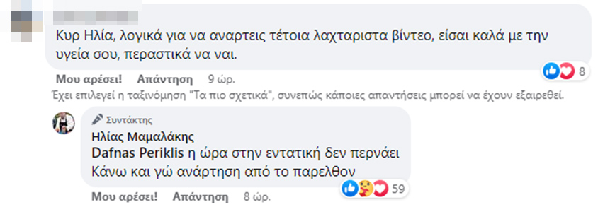 Μία διαδικτυακή του φίλη του σχολίασε: «Κυρ Ηλία, λογικά για να ανεβάζεις τέτοια λαχταριστά βίντεο, είσαι καλά με την υγεία σου, περαστικά να’ ναι» συμπεραίνοντας πως έχει πάρει εξιτήριο ενώ ο ίδιος απάντησε: «Η ώρα στην εντατική δεν περνάει. Κάνω και εγώ ανάρτηση από το παρελθόν».