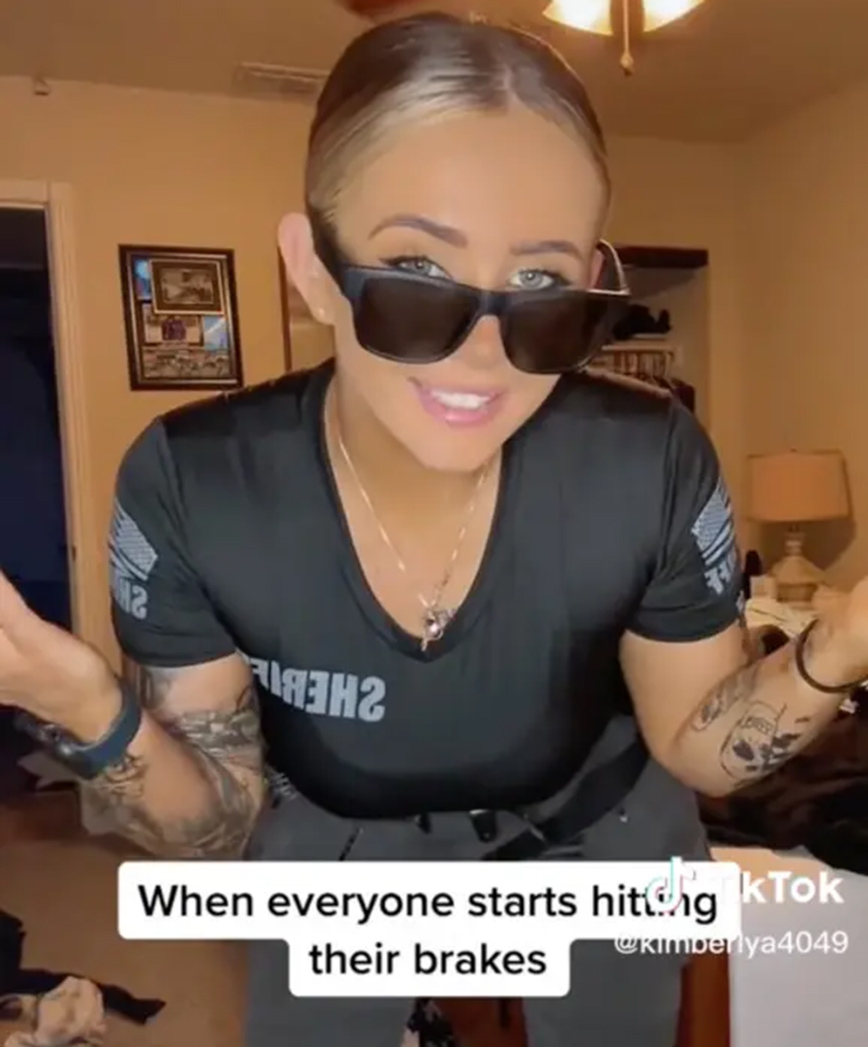 Η TikToker, γνωστή ως Kimberly, μοιράστηκε αρκετά βίντεο – απάντηση, στα οποία εμφανίζεται με τη στολή της. Σε ένα βίντεο που δημοσιεύτηκε τον περασμένο Ιούνιο και μετρά 4 εκατομμύρια views, φαίνεται η ίδια να παίρνει διάφορες εκφράσεις σχετικά με ένα σχόλιο που έλεγε: «Δεν είσαι πραγματική αστυνομικός». Στη συνέχεια φαίνεται να κάθεται στο υπηρεσιακό όχημα με ένα αλεξίσφαιρο γιλέκο.