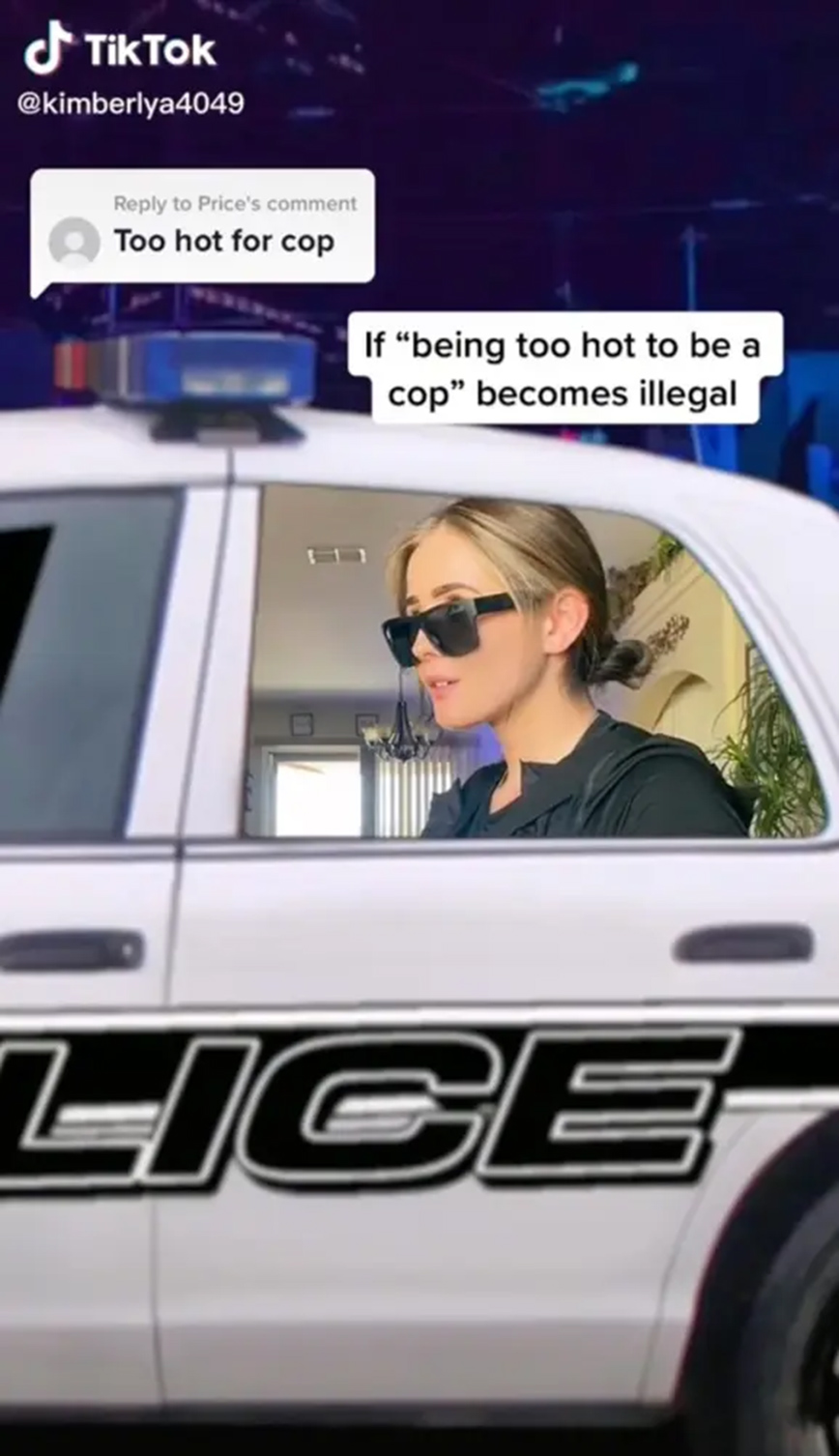 Σε ένα δεύτερο βίντεο, η Kimberly απάντησε σε όσους λένε ότι «είναι πολύ καυτή για να είναι αστυνομικός». «Αν το να είσαι πολύ καυτή για να είσαι αστυνομικός γίνει παράνομο», έγραψε στο κλιπ που τη δείχνει στο περιπολικό.