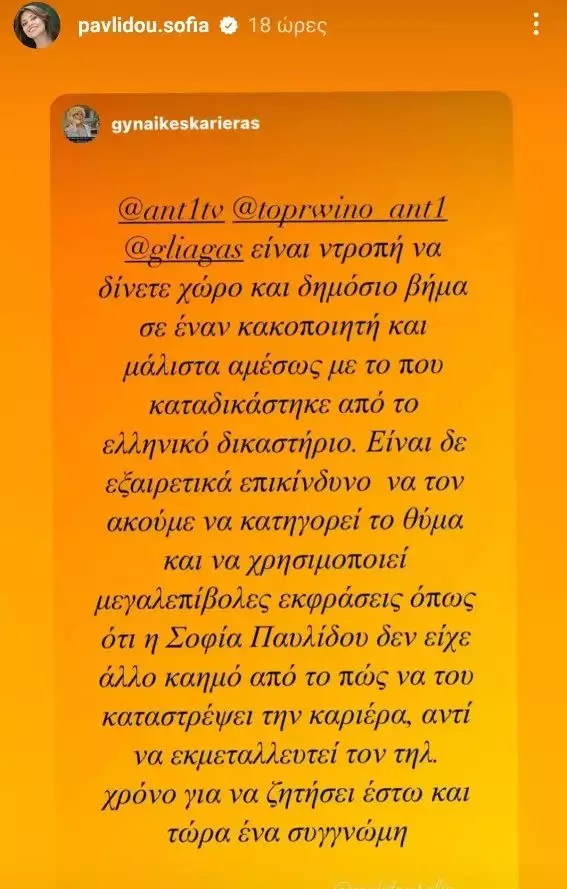 Τη συνέντευξη του Μάνου Παπαγιάννη στον ΑΝΤ1, μετά την δικαστική απόφαση που τον έκρινε ένοχο για απλή σωματική βλάβη, σχολίασε η Σοφία Παυλίδου, μέσα από τον προσωπικό της λογαριασμό στο Instagram.
