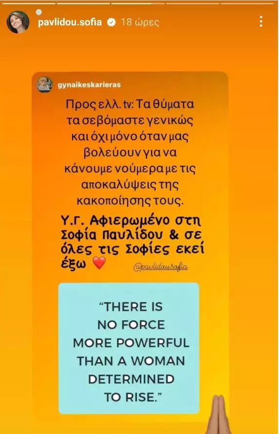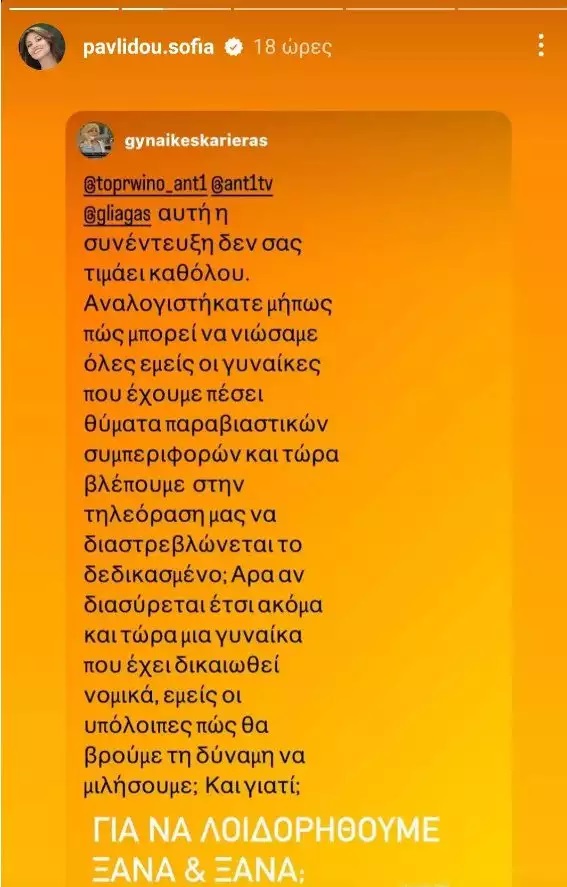 Συγκεκριμένα, η ηθοποιός δημοσιοποίησε κάποια σχόλια που έκανε υπέρ της η σελίδα «Γυναίκες Καριέρας», μέσω των οποίων ασκεί έντονη κριτική στο κανάλι για το γεγονός ότι έδωσε βήμα σ’ ένα άτομο που έχει κριθεί ένοχο για ένα λεπτό ζήτημα.