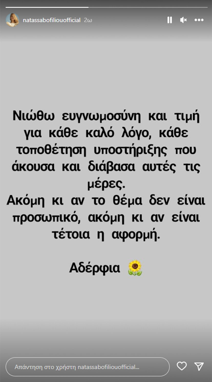«Νιώθω ευγνωμοσύνη και τιμή για κάθε καλό λόγο, κάθε τοποθέτηση υποστήριξης που άκουσα και διάβασα αυτές τις μέρες. Ακόμα και αν το θέμα δεν είναι προσωπικό, ακόμα κι αν είναι τέτοια η αφορμή. Αδέρφια» έγραψε η τραγουδίστρια στον προσωπικό της λογαριασμό στο Instagram σε story.