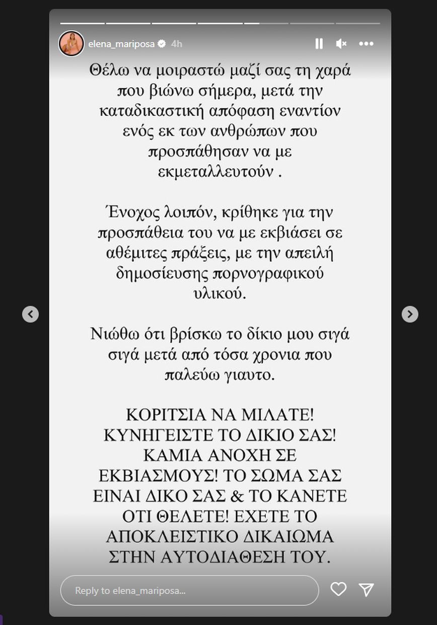 «Θέλω να μοιραστώ μαζί σας τη χαρά που βιώνω σήμερα, μετά την καταδικαστική απόφαση εναντίον ενός εκ των ανθρώπων που προσπάθησαν να με εκμεταλλευτούν. Ένοχος, λοιπόν, κρίθηκε για την προσπάθεια του να με εκβιάσει σε αθέμιτες πράξεις, με την απειλή δημοσίευσης πορνογραφικού υλικού.