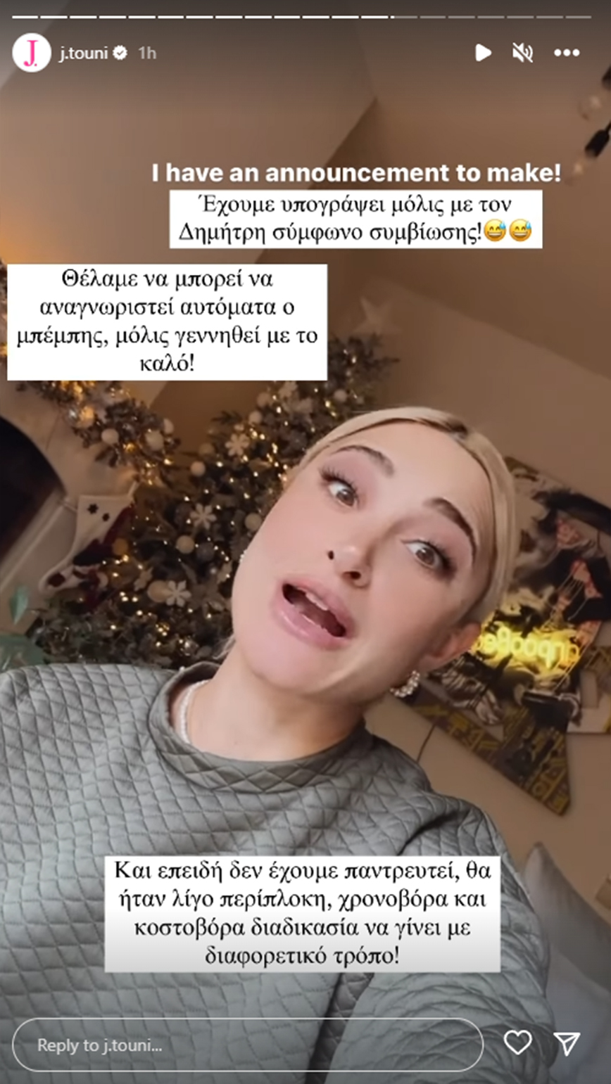 «Έχουμε υπογράψει μόλις σύμφωνο συμβίωσης με τον Δημήτρη. Θέλαμε να μπορεί να αναγνωριστεί αυτόματα ο μπέμπης, μόλις γεννηθεί με το καλό. Και επειδή δεν έχουμε παντρευτεί, θα ήταν λίγο περίπλοκη, χρονοβόρα και κοστοβόρα διαδικασία να γίνει με διαφορετικό τρόπο» έγραψε η Ιωάννα Τούνη στο πρώτο story.