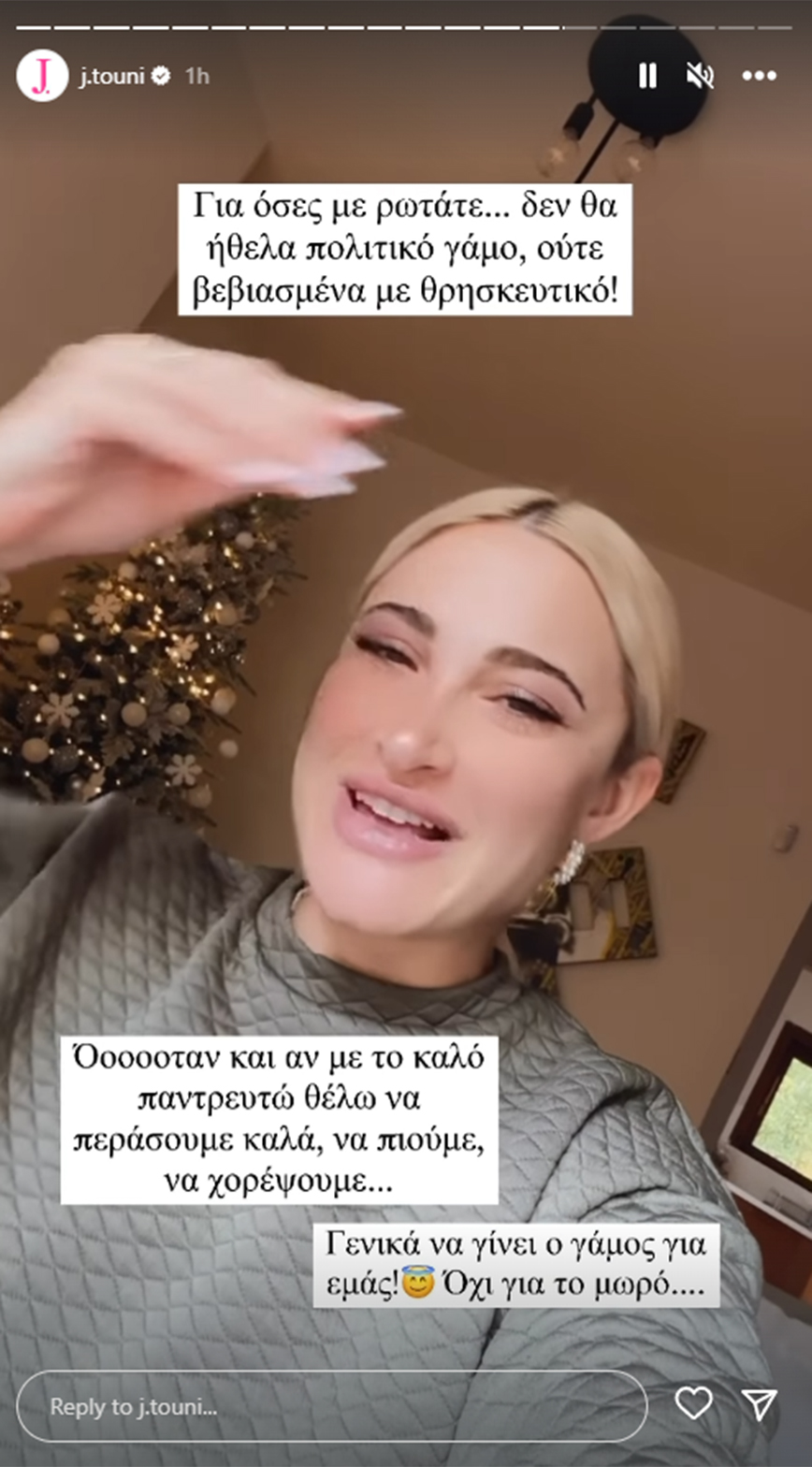 Στη συνέχεια, η Ιωάννα Τούνη αναφέρθηκε στο ενδεχόμενο ενός πολιτικού ή θρησκευτικού γάμου. «Για όσες με ρωτάτε, δεν θα ήθελα πολιτικό γάμο ούτε βεβιασμένα με θρησκευτικό! Όοοοταν και αν με το καλό παντρευτώ, θέλω να περάσουμε καλά, να πιούμε, να χορέψουμε. Γενικά να γίνει ο γάμος εμάς! Όχι για το μωρό» ξεκαθάρισε η Ιωάννα Τούνη.