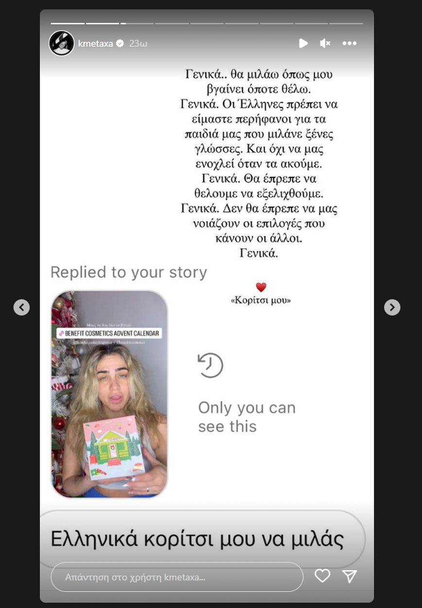 Αυτό φαίνεται πως ενόχλησε κάποιον διαδικτυακό της φίλο ο οποίος της έστειλε μήνυμα να μιλάει ελληνικά.