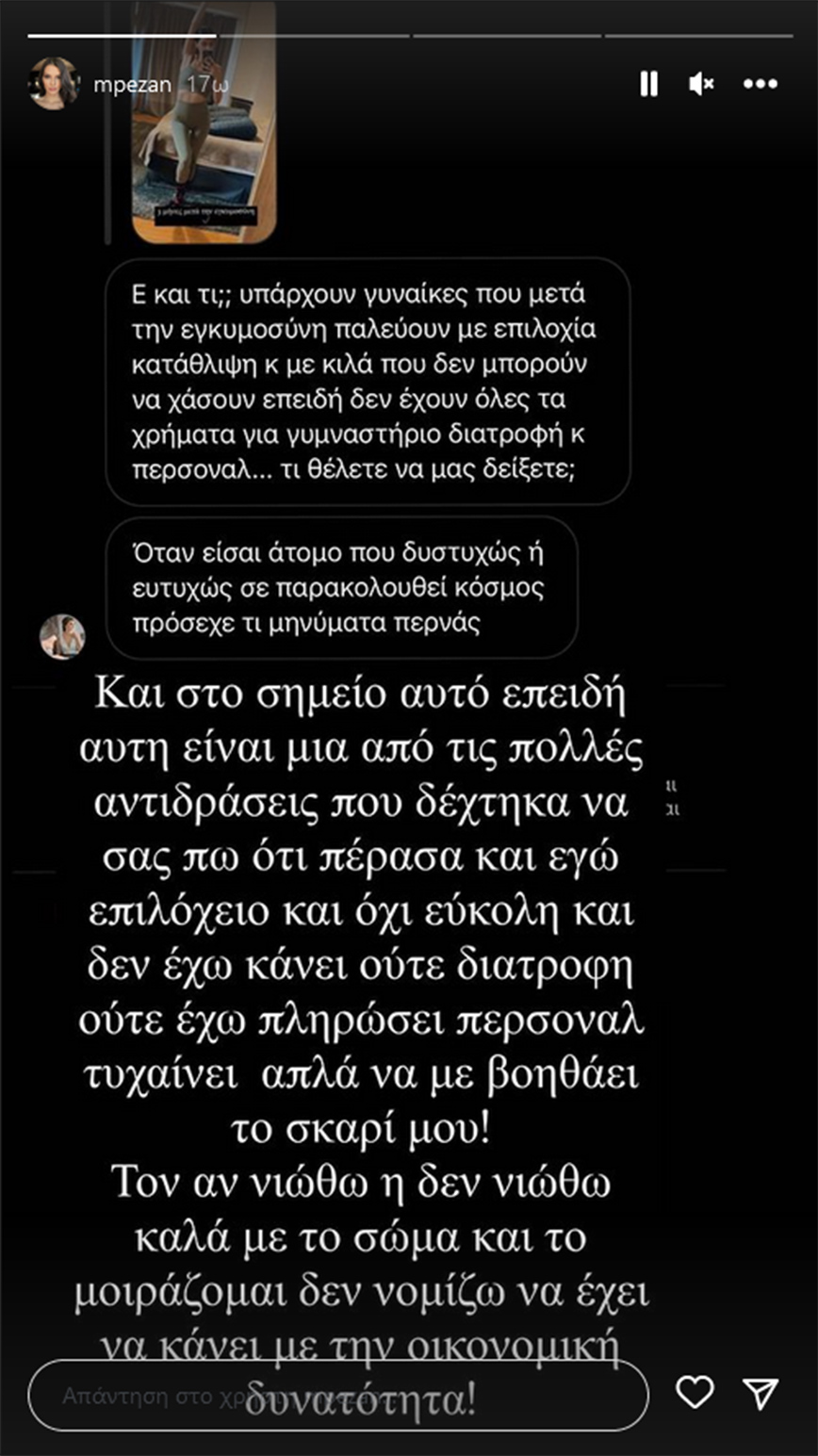 «Και στο σημείο αυτό επειδή αυτή είναι μία από τις πολλές αντιδράσεις που δέχθηκα να σας πω ότι πέρασα και εγώ επιλόχειο και όχι εύκολη και δεν έχω κάνει ούτε διατροφή ούτε έχω πληρώσει πέρσοναλ. Τυχαίνει απλά να με βοηθάει το σκαρί μου! Το αν νιώθω η δεν νιώθω καλά με το σώμα και το μοιράζομαι δεν νομίζω να έχει να κάνει με την οικονομική δυνατότητα» απάντησε η νεαρή.