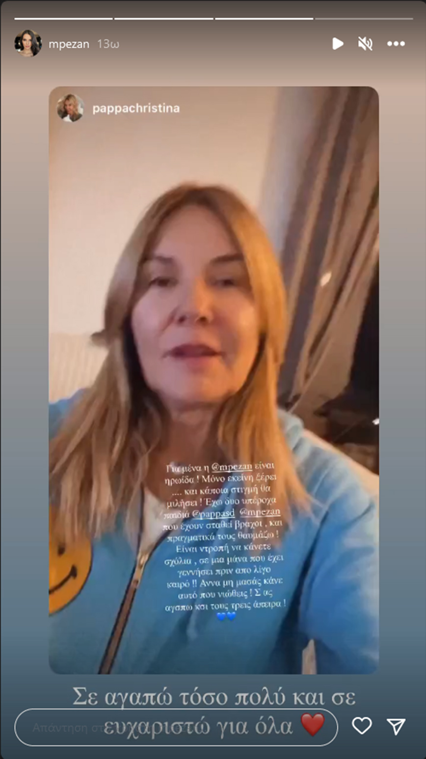 «Να ξέρετε λοιπόν, επειδή η Άννα το ομολόγησε μόνη της, έχει περάσει επιλόχειο. Στους γονείς αυτούς έχει συμβεί κάτι πολύ άσχημο που εύχομαι σε κανένα να μη συμβεί, όταν αποφασίσει η Άννα θα το πει μόνη της. Κλείστε τα στόματά σας, γεννήθηκε ο Χριστός αυτές τις μέρες, οπότε πείτε και έναν καλό λόγο, αφήστε την κακία να πάει κάτω» ανέφερε μεταξύ άλλων, η Χριστίνα Παππά σε story που αναδημοσίευσε η Άννα Μπεζάν και έγραψε: «Σε αγαπώ τόσο πολύ και σε ευχαριστώ για όλα».