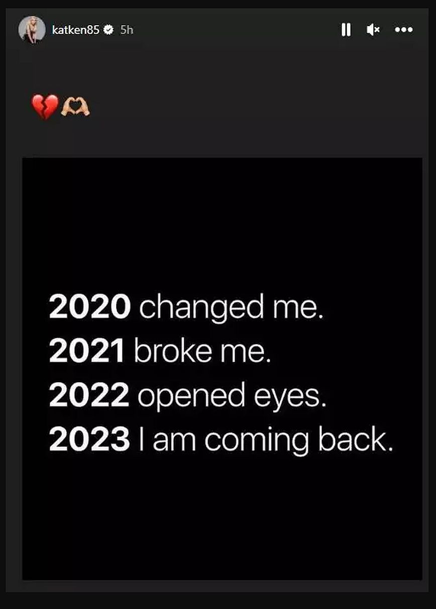 «2020 με άλλαξες. 2021 με πλήγωσες. 2022 μου άνοιξες τα μάτια. 2023 επιστρέφω» έγραψε χαρακτηριστικά η γοητευτική παρουσιάστρια στην ιστορία που ανέβασε στον προσωπικό της λογαριασμό στο Instagram.