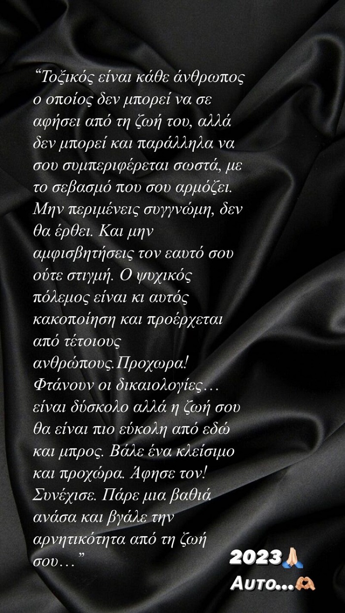 «Τοξικός είναι κάθε άνθρωπος, ο οποίος δεν μπορεί να σε αφήσει από τη ζωή του, αλλά δεν μπορεί και παράλληλα να σου συμπεριφέρεται σωστά, με το σεβασμό που σου αρμόζει. Μην περιμένεις συγνώμη, δεν θα έρθει. Και μην αμφισβητήσεις τον εαυτό σου ούτε στιγμή. Ο ψυχικός πόλεμος είναι κι αυτός κακοποίηση και προέρχεται από τέτοιους ανθρώπους. Προχώρα! Φτάνουν οι δικαιολογίες… Είναι δύσκολο άλλα η ζωή σου θα είναι πιο εύκολη από δω και μπρος. Βάλε ένα κλείσιμο και προχώρα. Άφησε τον! Συνέχισε. Πάρε μια βαθιά ανάσα και βγάλε την αρνητικότητα απ’ τη ζωή σου!».