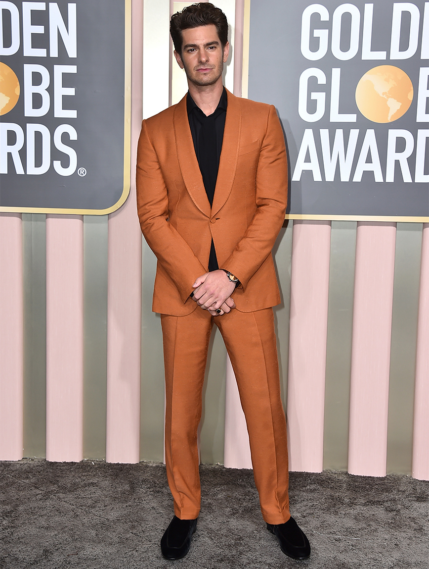 Ο Άντριου Γκάρφιλντ αποφάσισε να ξεφύγει από το κλασικό μαύρο σμόκιν για το κόκκινο χαλί και προτίμησε πορτοκαλί κοστούμι, το οποίο συνδύασε με μαύρο πουκάμισο.
