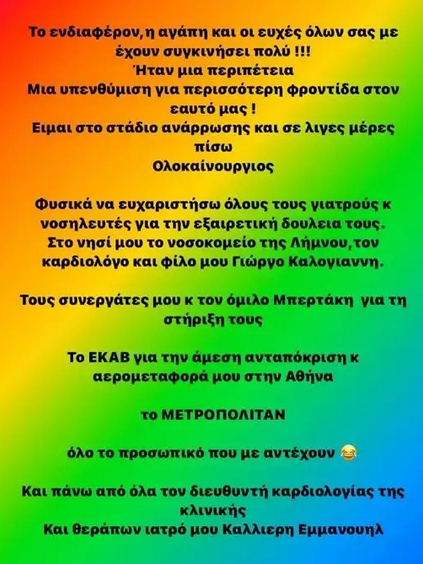 Ειδικότερα, μέσα από τον προσωπικό του λογαριασμό στο Instagram, ο Στέλιος Ρόκκος θέλησε να ενημερώσει τους διαδικτυακούς του φίλους για την κατάσταση της υγείας του. » Το ενδιαφέρον, η αγάπη και οι ευχές όλων σας με έχουν συγκινήσει πολύ!! Ήταν μια περιπέτεια. Μια υπενθύμιση για περισσότερη φροντίδα στον εαυτό μας! Είμαι στο στάδιο της ανάρρωσης και σε λίγες μέρες πίσω, ολοκαίνουργιος. Φυσικά να ευχαριστήσω όλους τους γιατρούς και νοσηλευτές για την εξαιρετική δουλειά τους, Στο νησί μου το νοσοκομείο Λήμνου, τον καρδιολόγο και φίλο μου Γιώργο Καλογιάννη. Τους συνεργάτες μου και τον όμιλο Μπερτάκη για τη στήριξη τους».