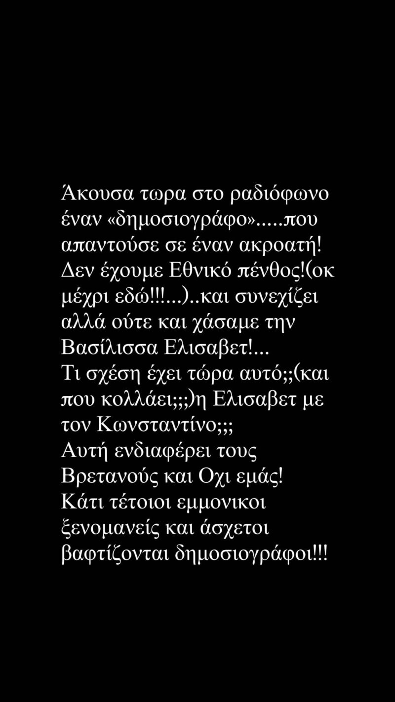 «Άκουσα τώρα στο ραδιόφωνο έναν “δημοσιογράφο” που απαντούσε σε έναν ακροατή! Δεν έχουμε Εθνικό πένθος (οκ μέχρι εδώ!!) και συνεχίζει “αλλά ούτε και χάσαμε την Βασίλισσα Ελισάβετ”. Τι σχέση έχει τώρα αυτό (και που κολλάει;) η Ελισάβετ με τον Κωνσταντίνο; Αυτή ενδιαφέρει τους Βρετανούς και όχι εμάς. Κάτι τέτοιοι εμμονικοί, ξενομανείς και άσχετοι βαφτίζονται δημοσιογράφοι», αναφέρει στην ανάρτησή του.