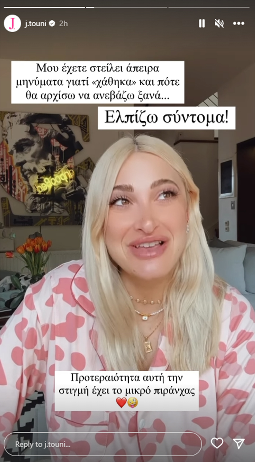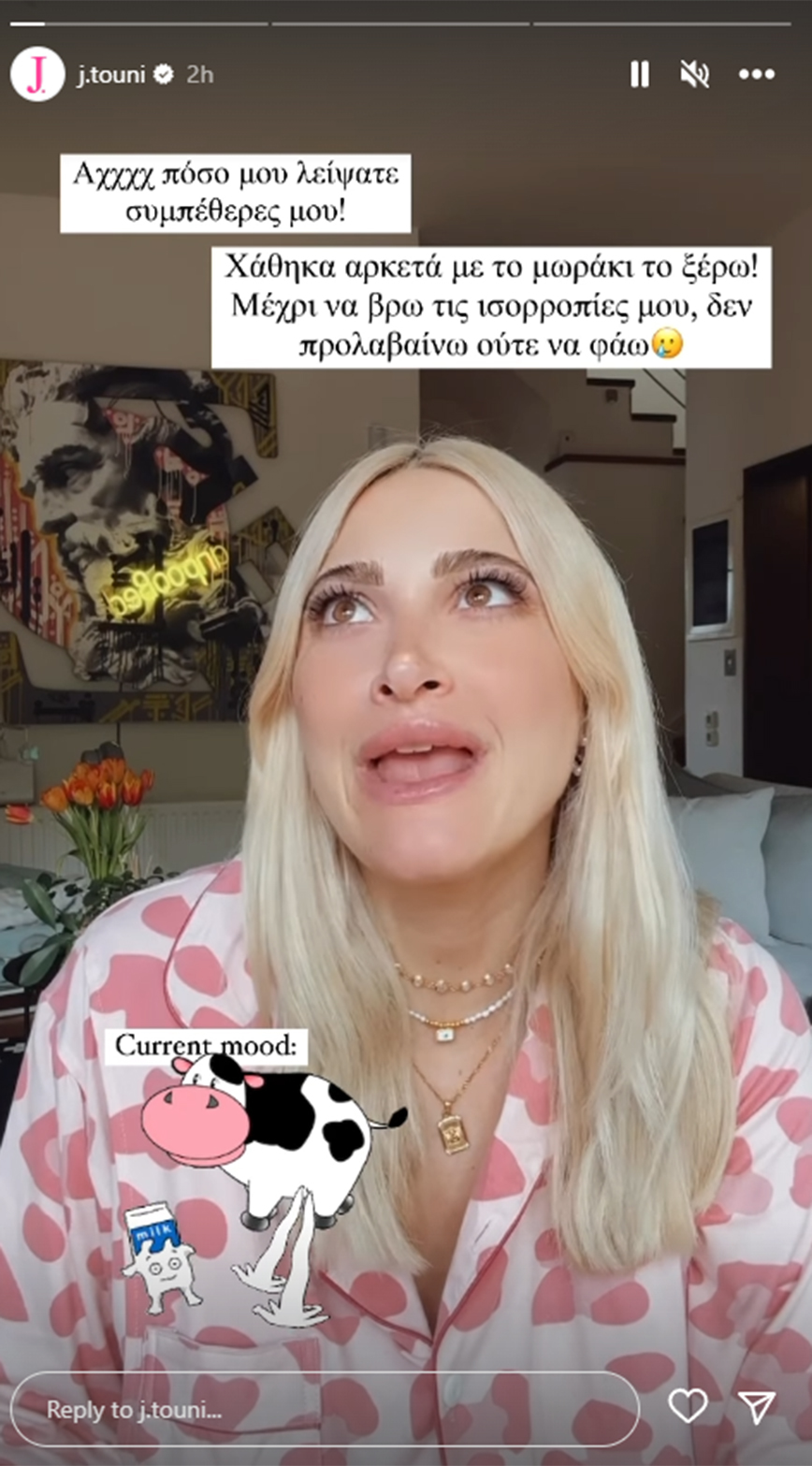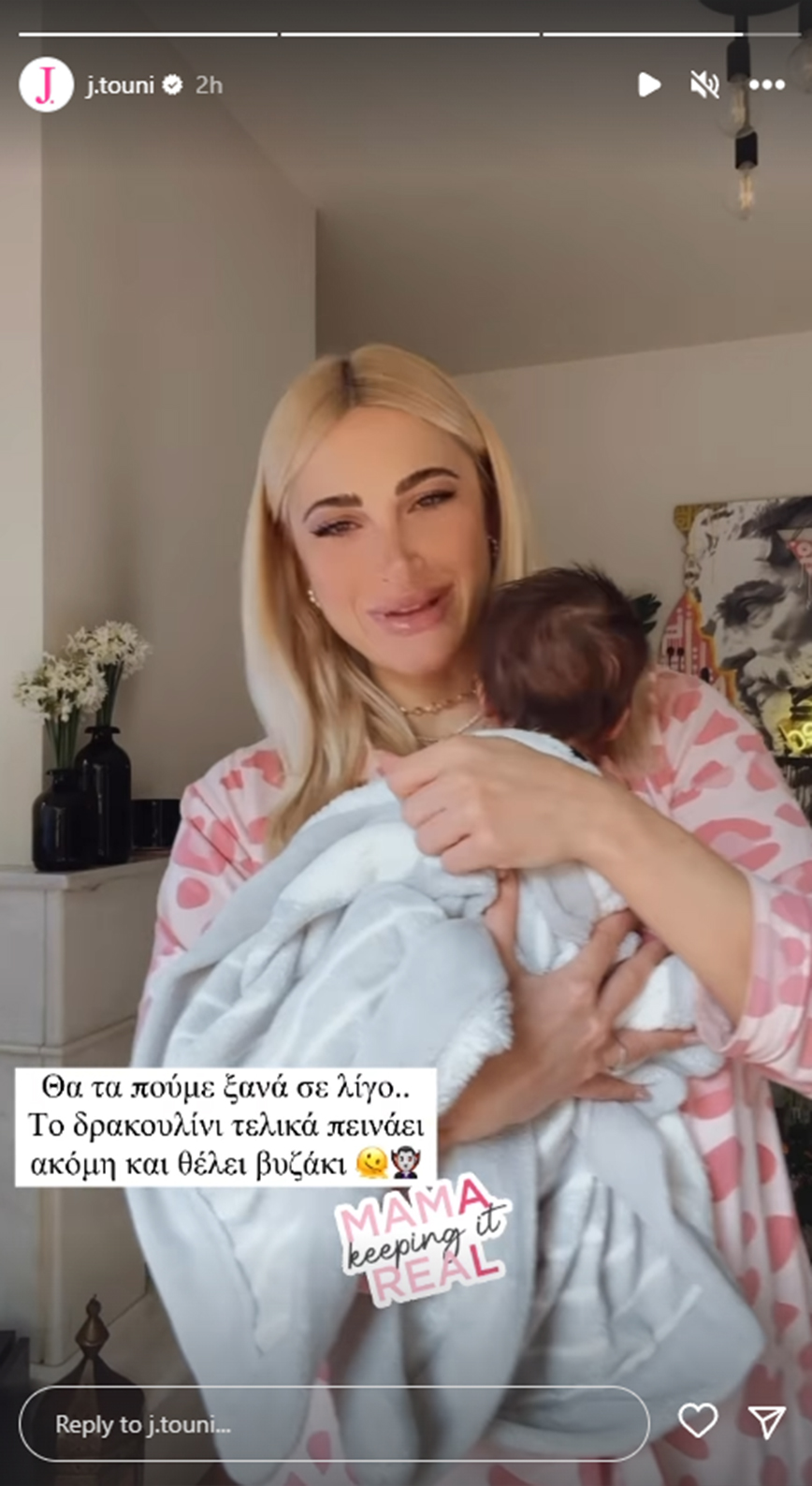 «Πόσο μου έχετε λείψει; Έχουν αλλάξει τα πάντα στη ζωή μου, περνάω μια φάση περίεργη, είμαι σούπερ κουρασμένη, κάνω αποκλειστικό θηλασμό, οπότε συνεπάγεται ότι είμαι μια μικρή αγελαδίτσα που δουλεύω 24ώρες το 24ωρο για παραγωγή γάλακτος. Δεν έχω κοιμηθεί εδώ και πάρα πολύ καιρό. Μου στέλνετε μέχρι και email και μου λέτε ” τι θα γίνει ρε Ιωάννα δεν θα ανεβάσεις ποτέ ξανά story;”. Ελπίζω να ανεβάσω stories κάποια στιγμή, αλλά αυτή τη στιγμή της ζωής μου έχουν άλλα προτεραιότητα. Προς το παρόν το δρακουλίνι αποφάσισε ότι θέλει και άλλο γάλα οπότε θα σας κάνω story μετά» λέει η Ιωάννα Τούνη.